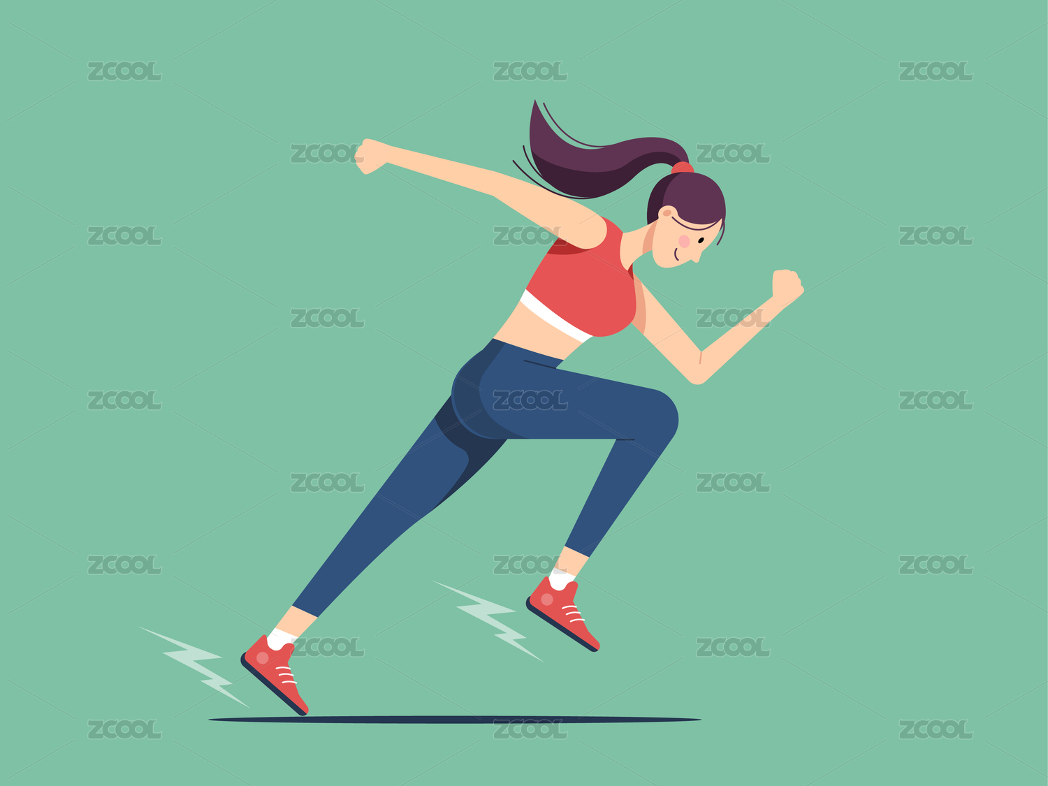 扁平插画青年女性在跑步的侧面