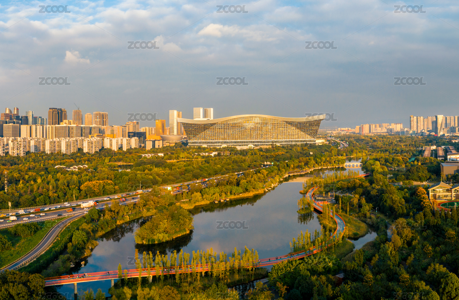成都地标建筑环球中心与锦城湖天府绿道栈桥