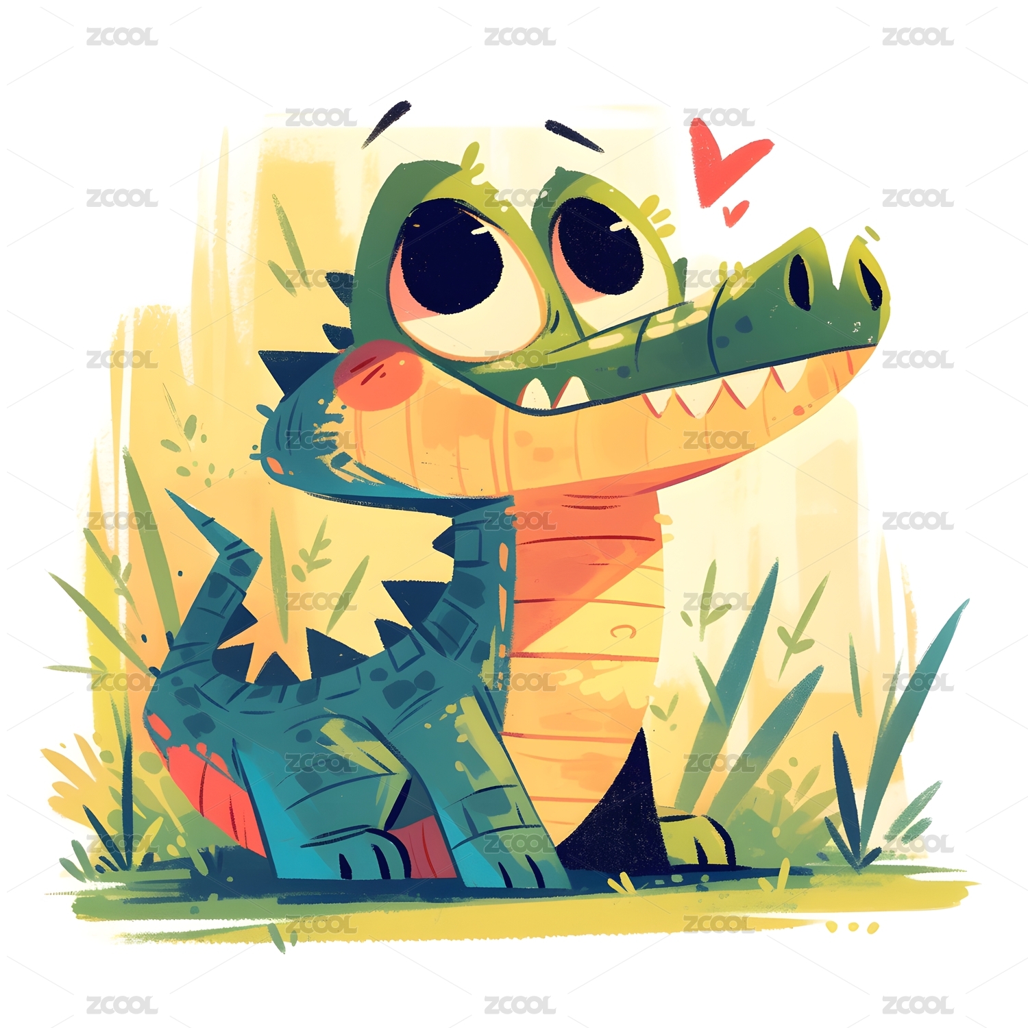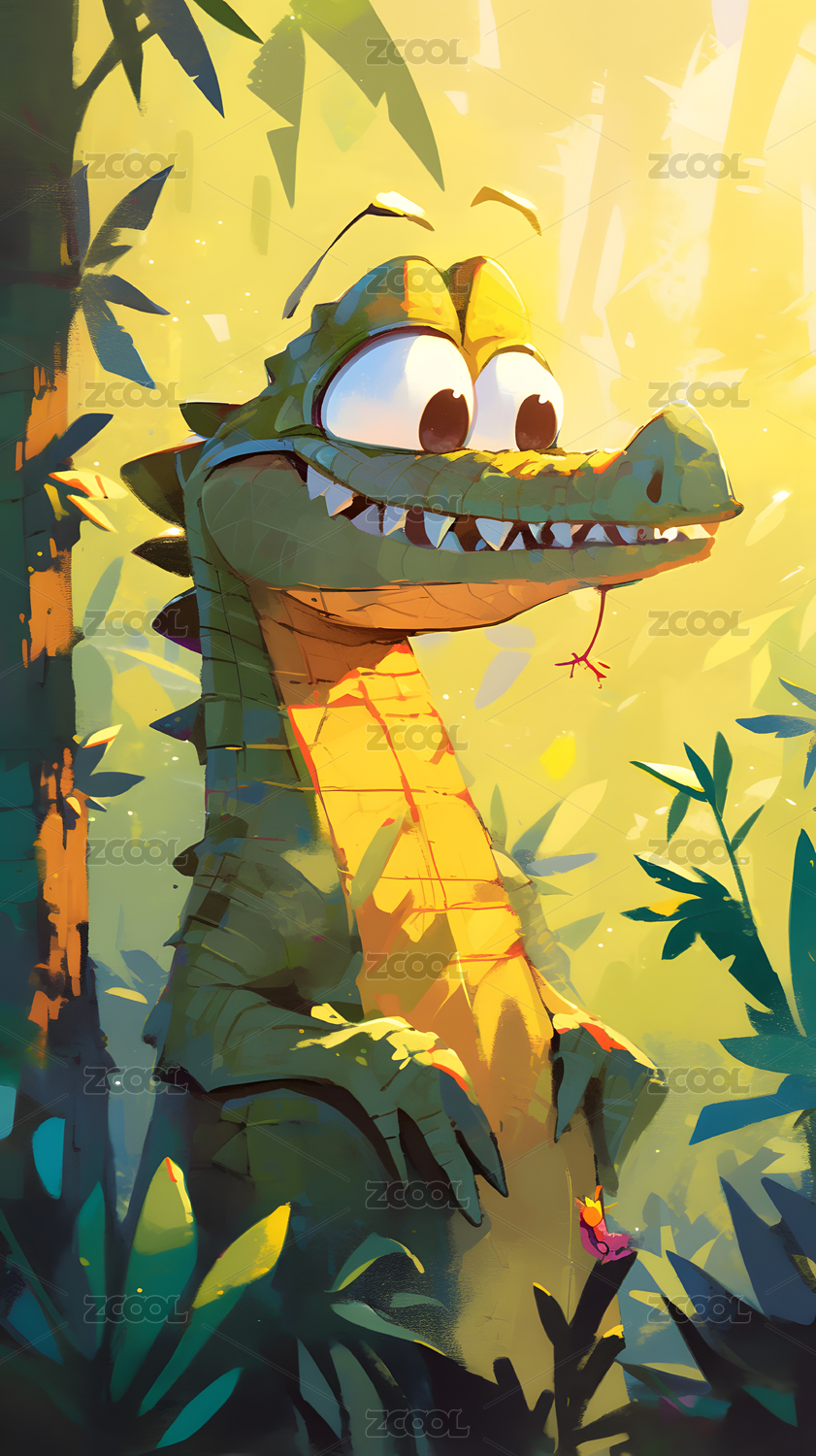 3D,阳光,AI数字艺术,鳄鱼,卡通,丛林,树枝,绿色,可爱,动物
