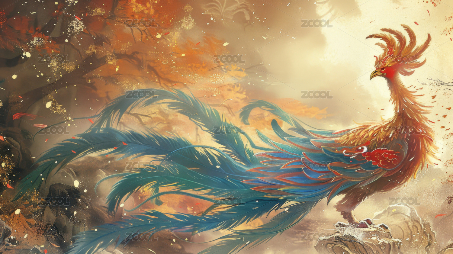 炫彩凤凰栖枝头秋季意境图