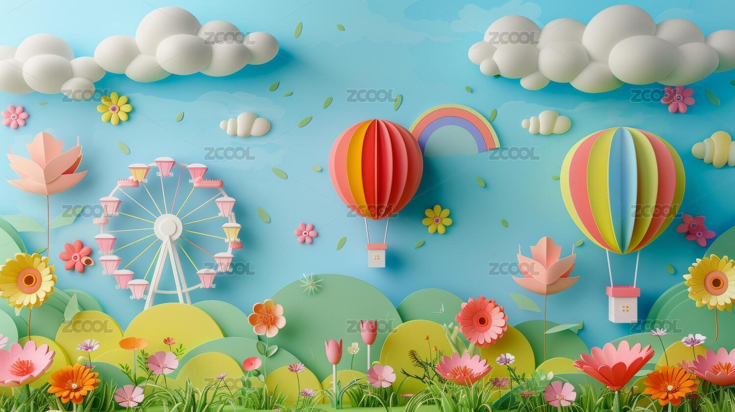 3D冒险旅行热气球飞行夏天卡通三维插画