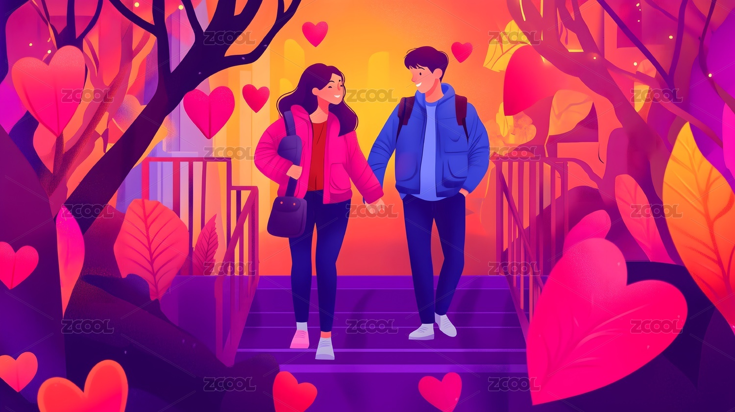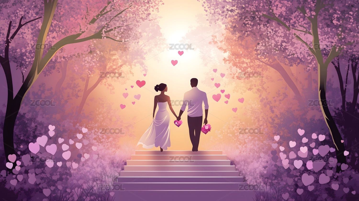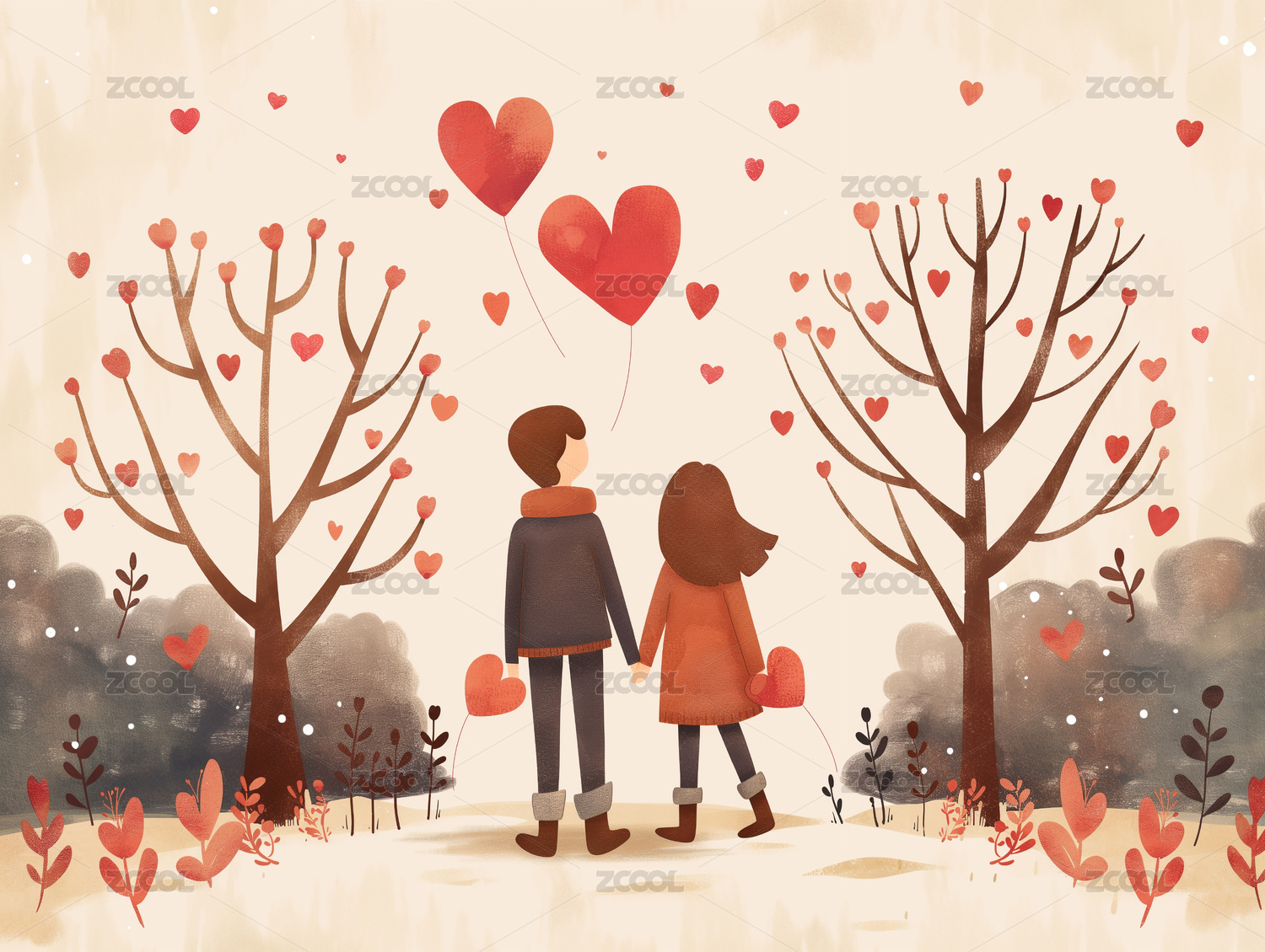 浪漫, 树木, 心形, 插画, 水彩, 粉色, 红色, 幸福, 手牵手,爱情