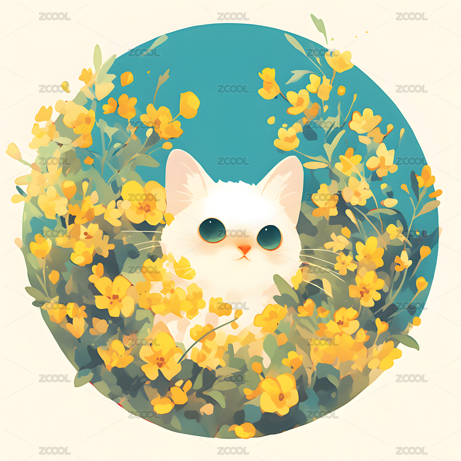 卡通可爱小白色猫咪头戴花环