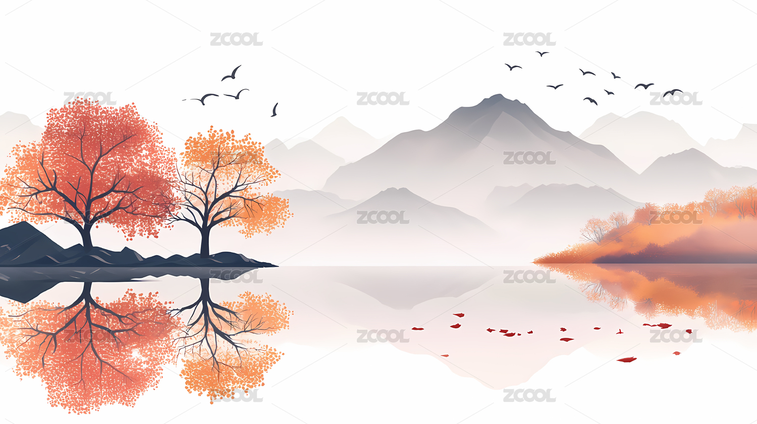 秋天,简约,插画,湖畔,宁静,风光,湖面,倒影,山脉,松树