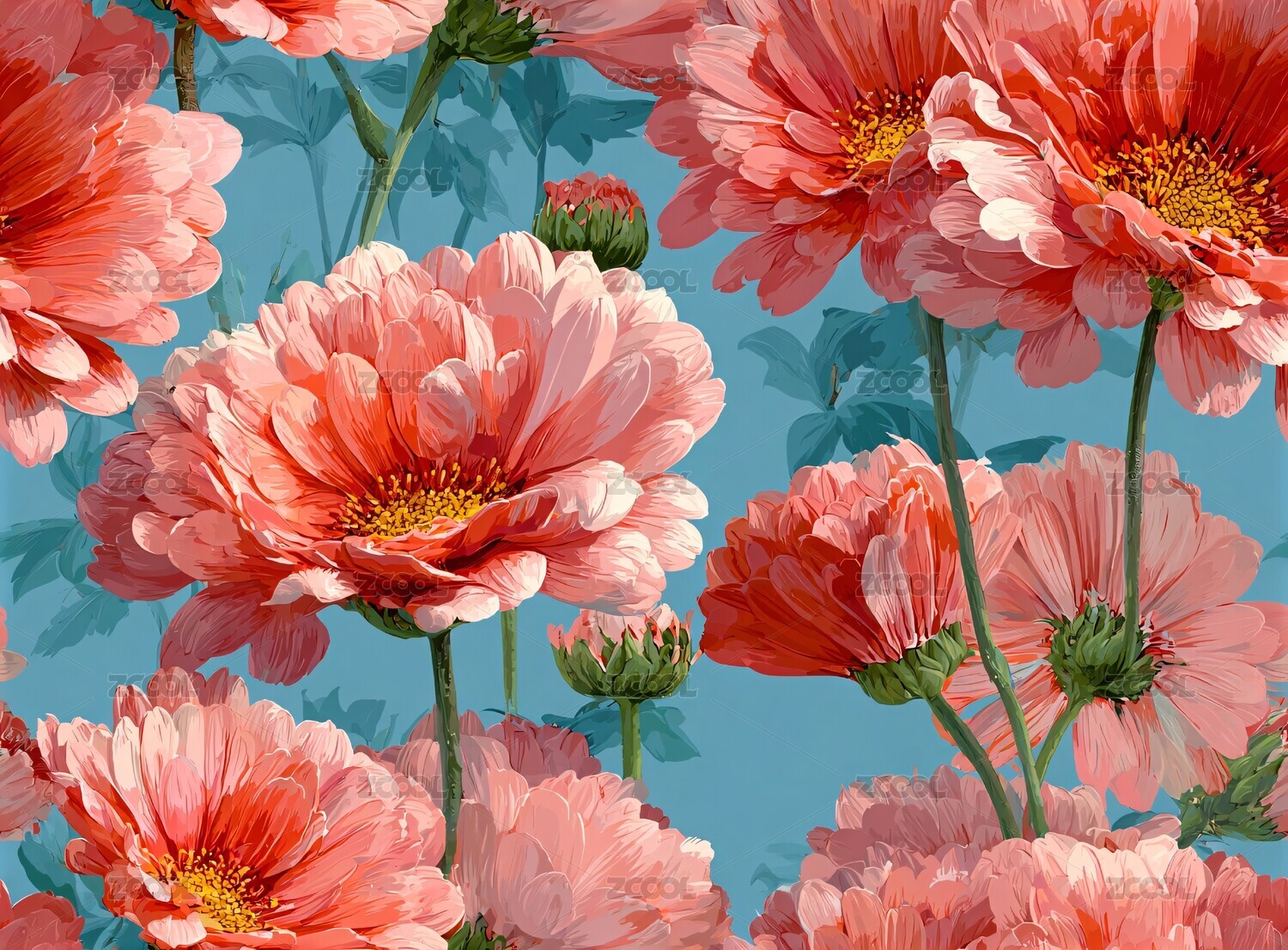 一幅令人惊叹的精致水彩画,描绘了各种菊花