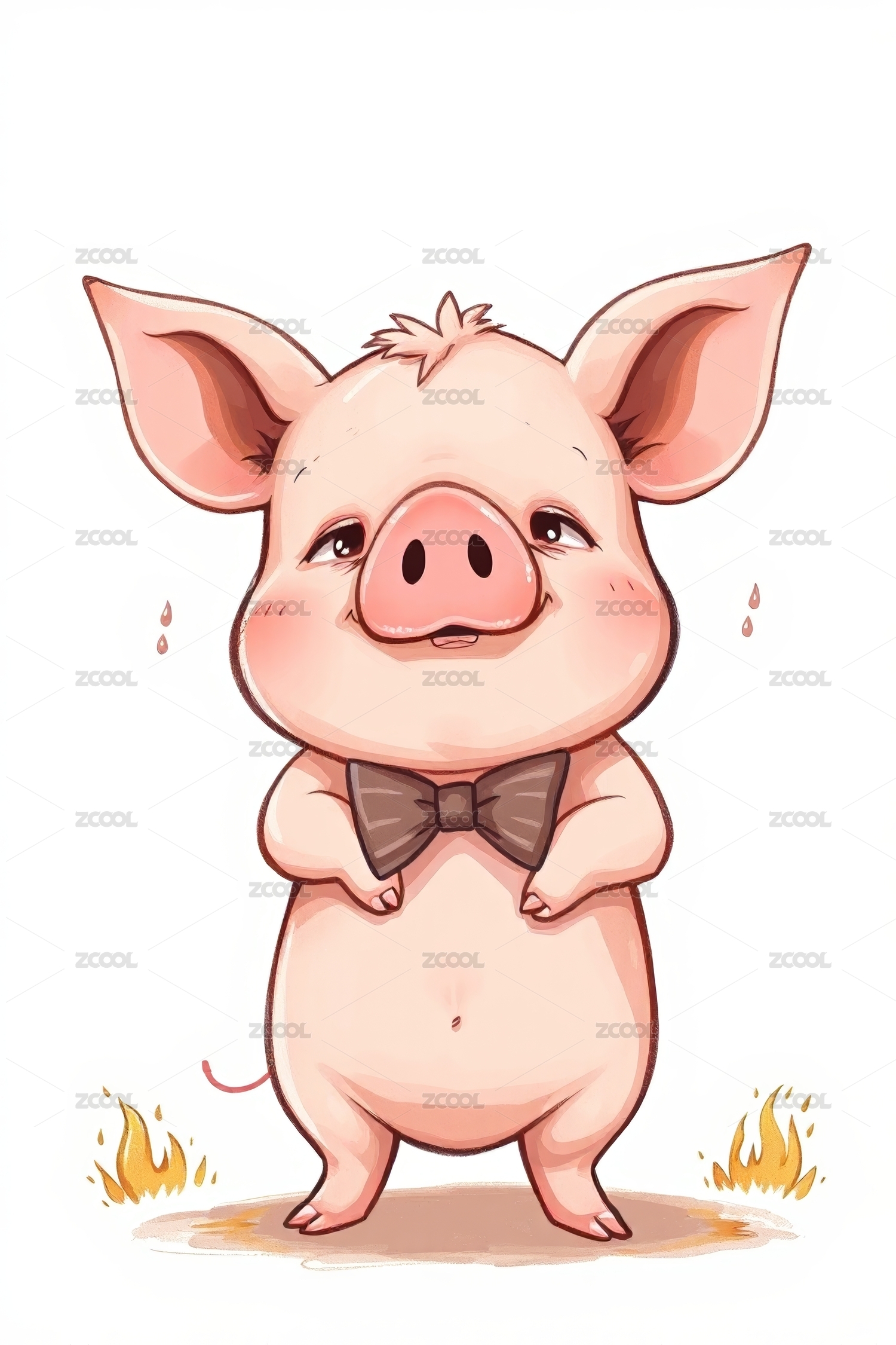 戴着领结的卡通猪站在火前高清图片