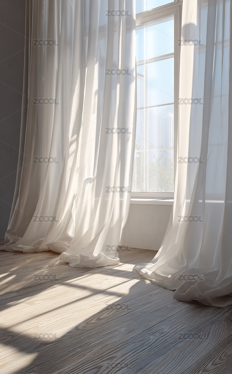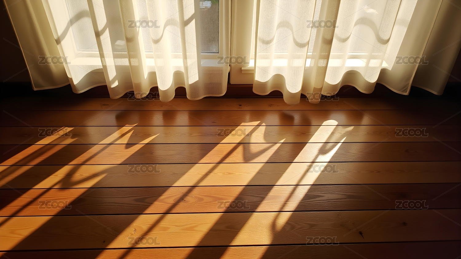 角落里,窗帘旁边,木纹地板上的地毯特写