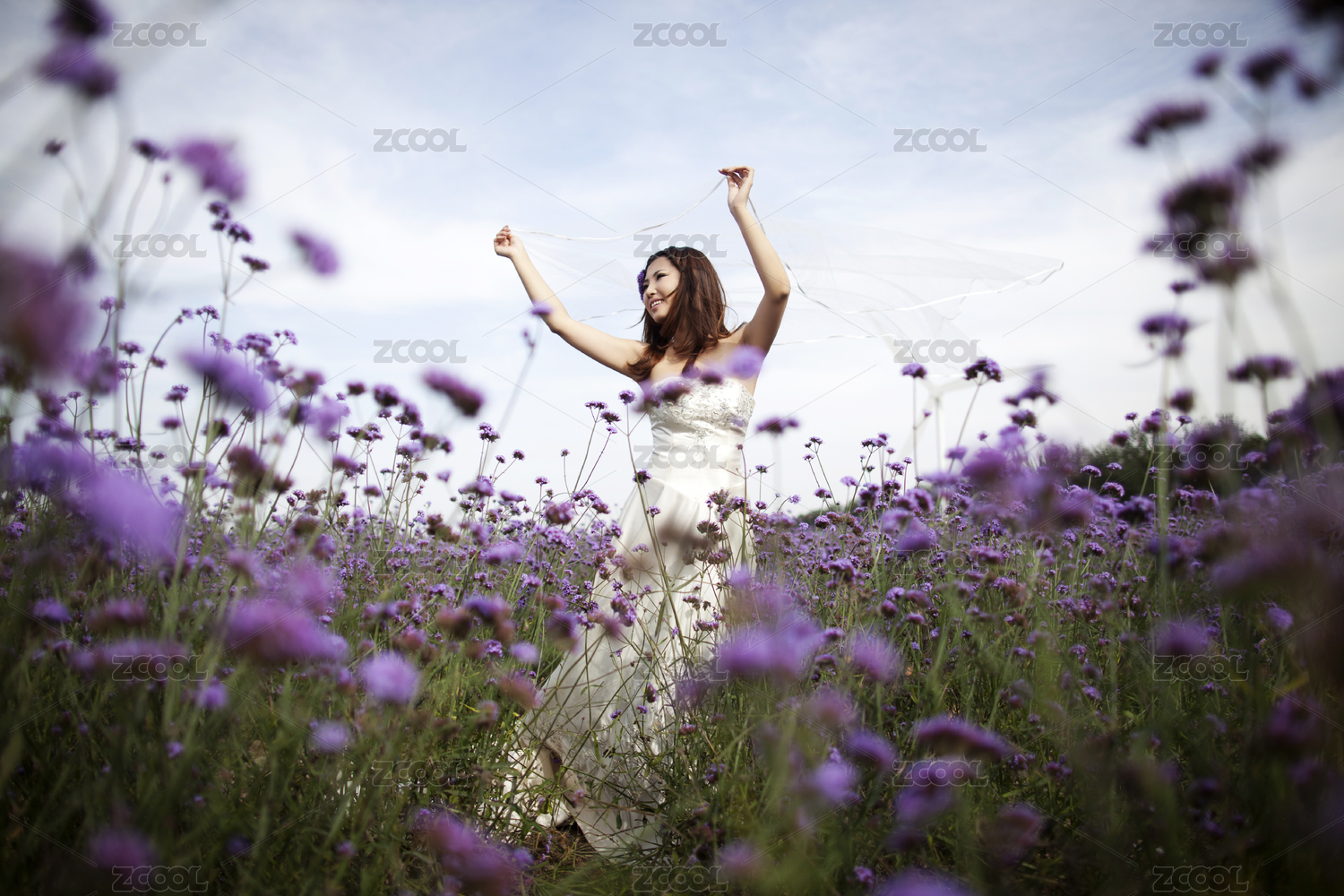 春天踏青赏花薰衣草色花田下的亚洲少女人像