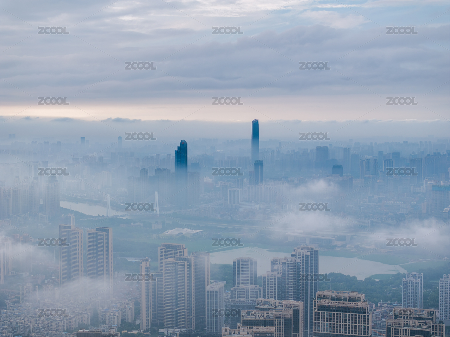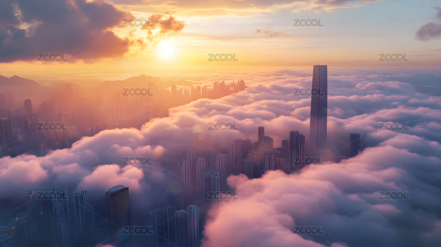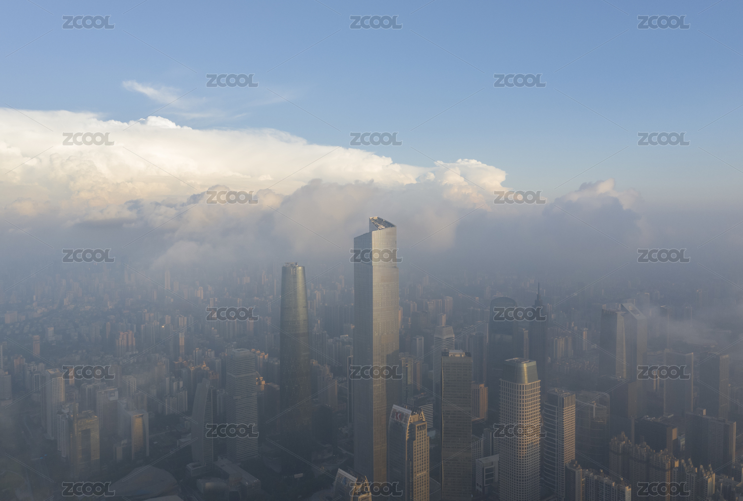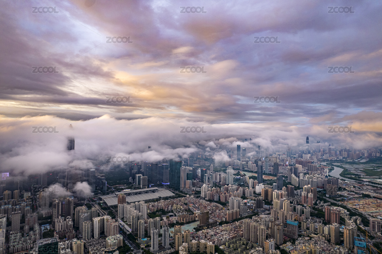 广州珠江岸城市建筑群与日出云雾航拍长图