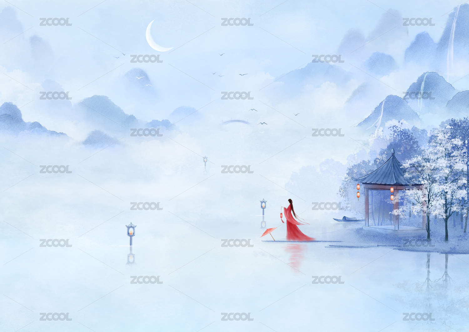 国风山水意境插画寒江丽影