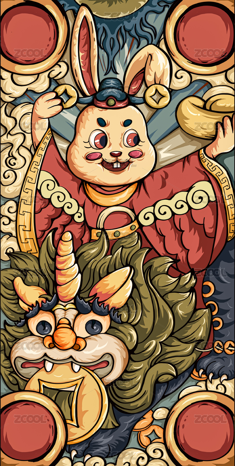 兔年贺岁国潮插画兔子拟人贵妃送财