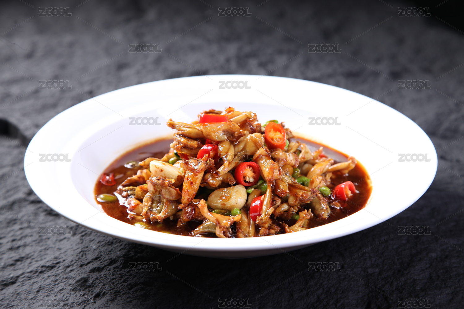 黑背景一盘家常菜爆炒香辣花蛤肉
