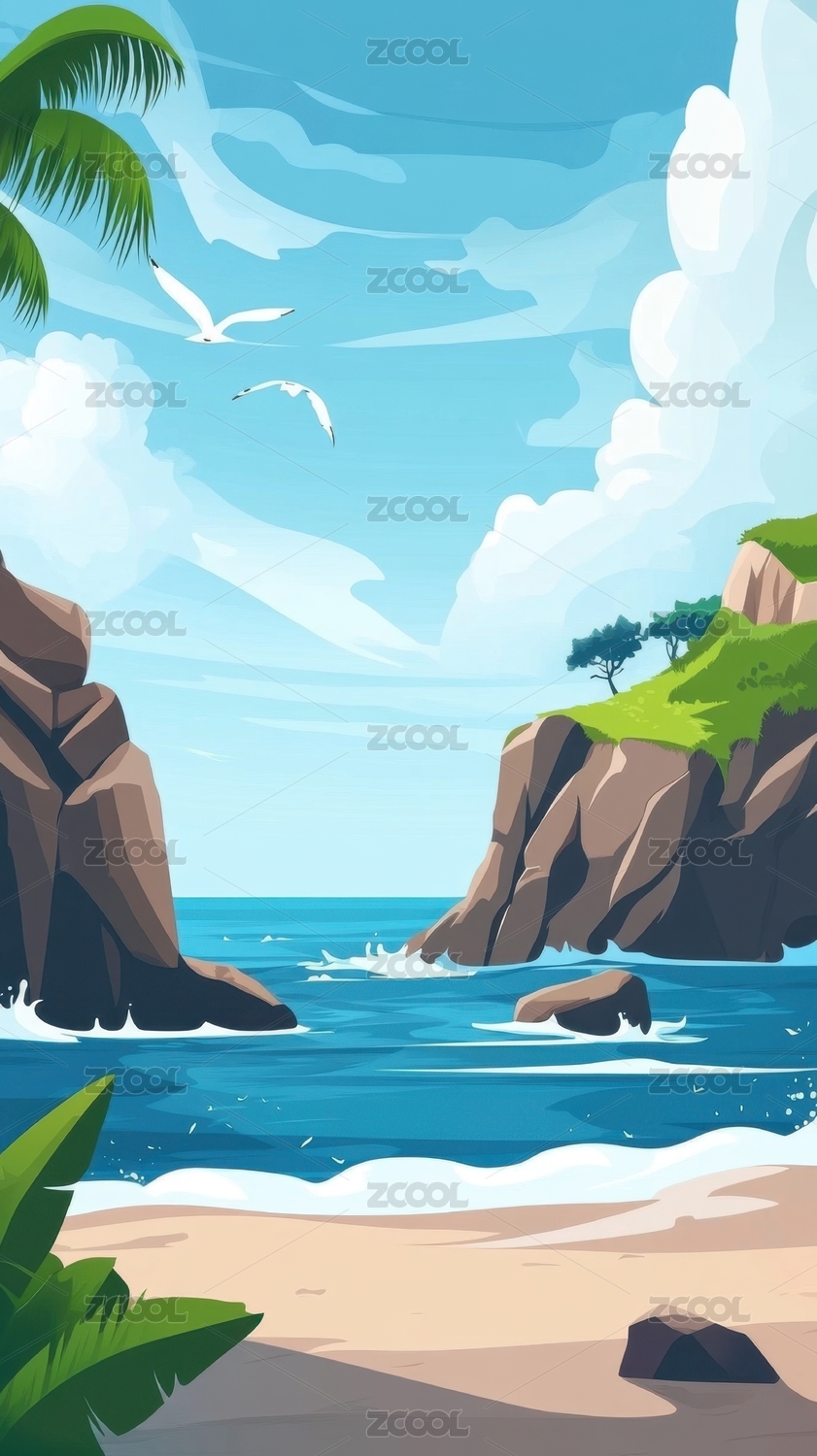 热带海边悬崖环绕的海湾景色涂鸦绘画插画