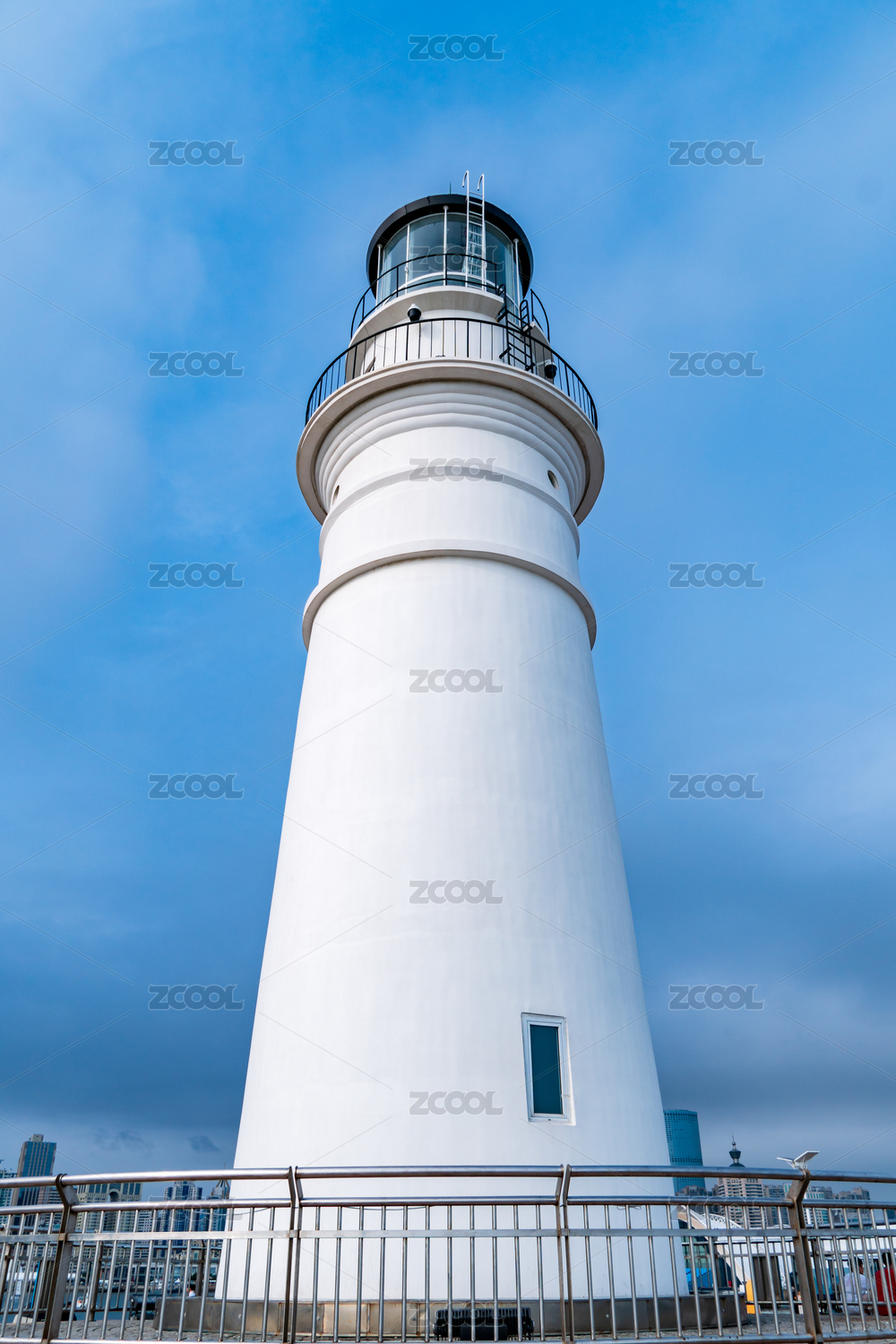 威海悦海公园晴朗蓝天下的灯塔俯视图