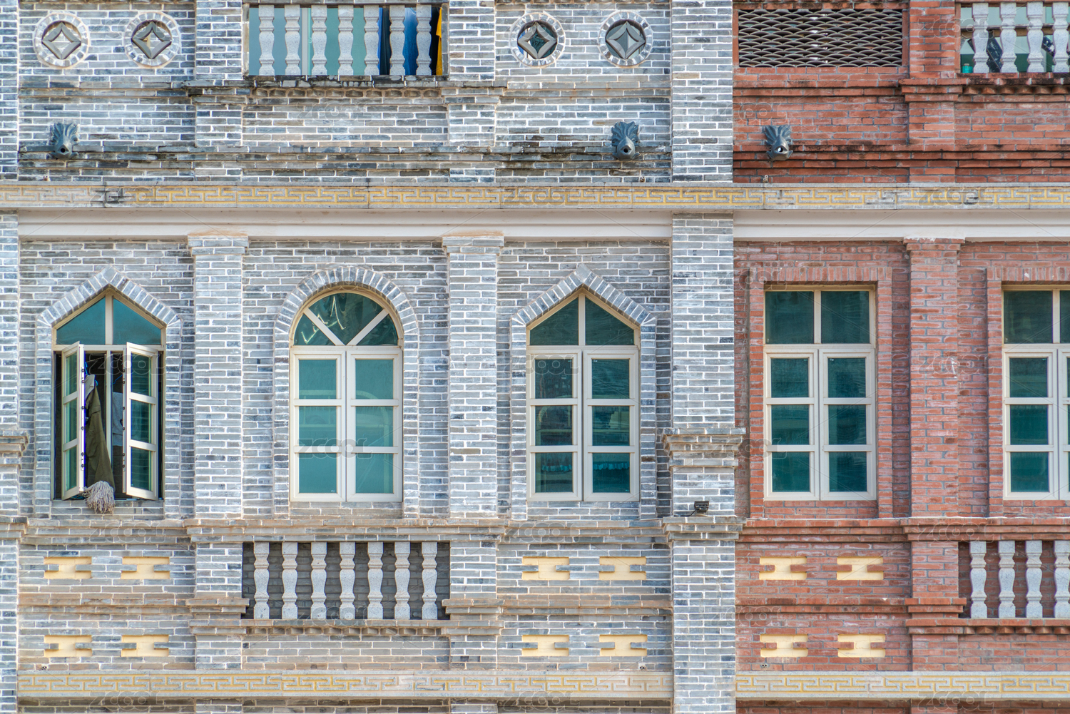 老上海砖墙建筑欧式拱形玻璃窗特写