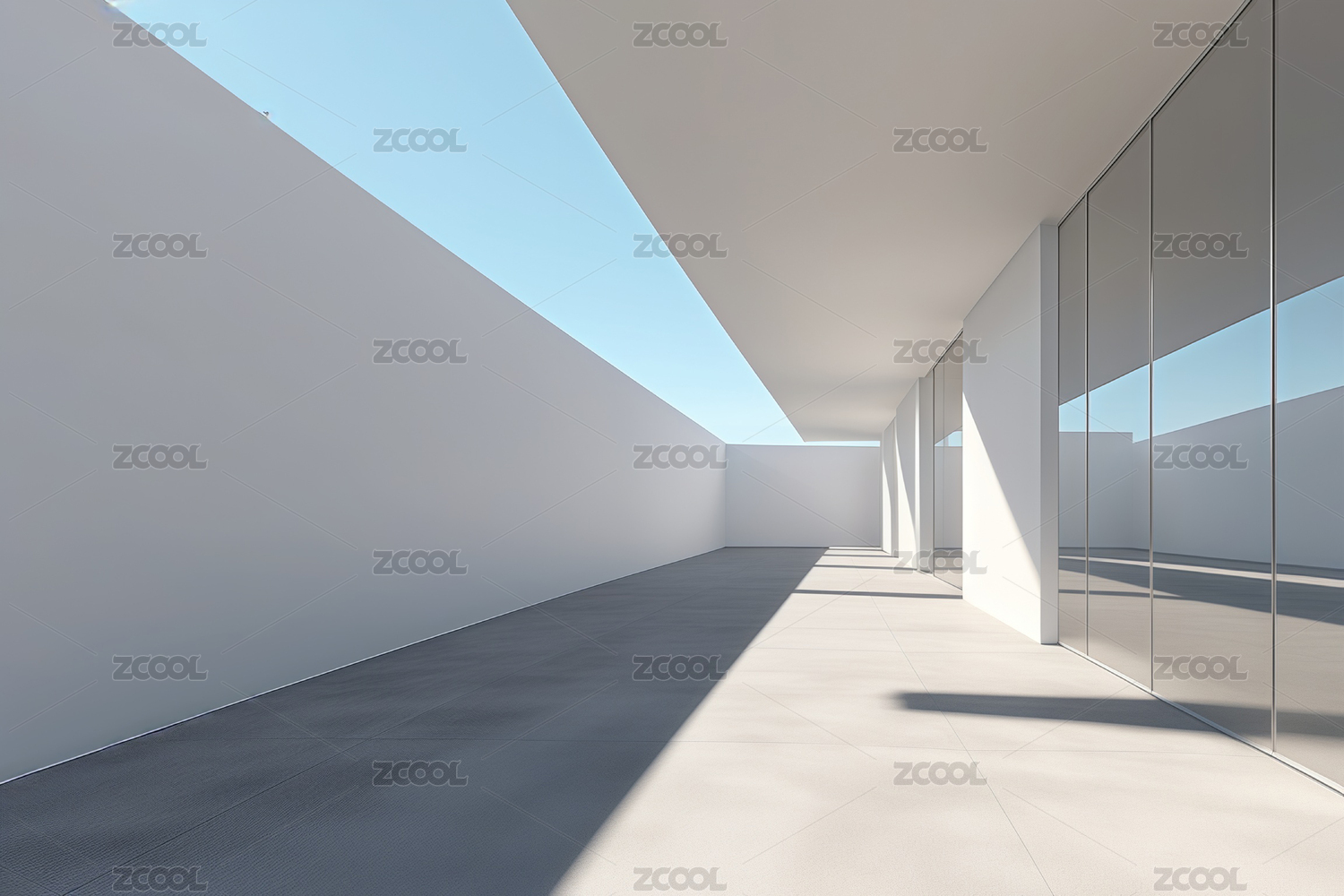 白色有落地窗的现代廊道延伸空间三维渲染