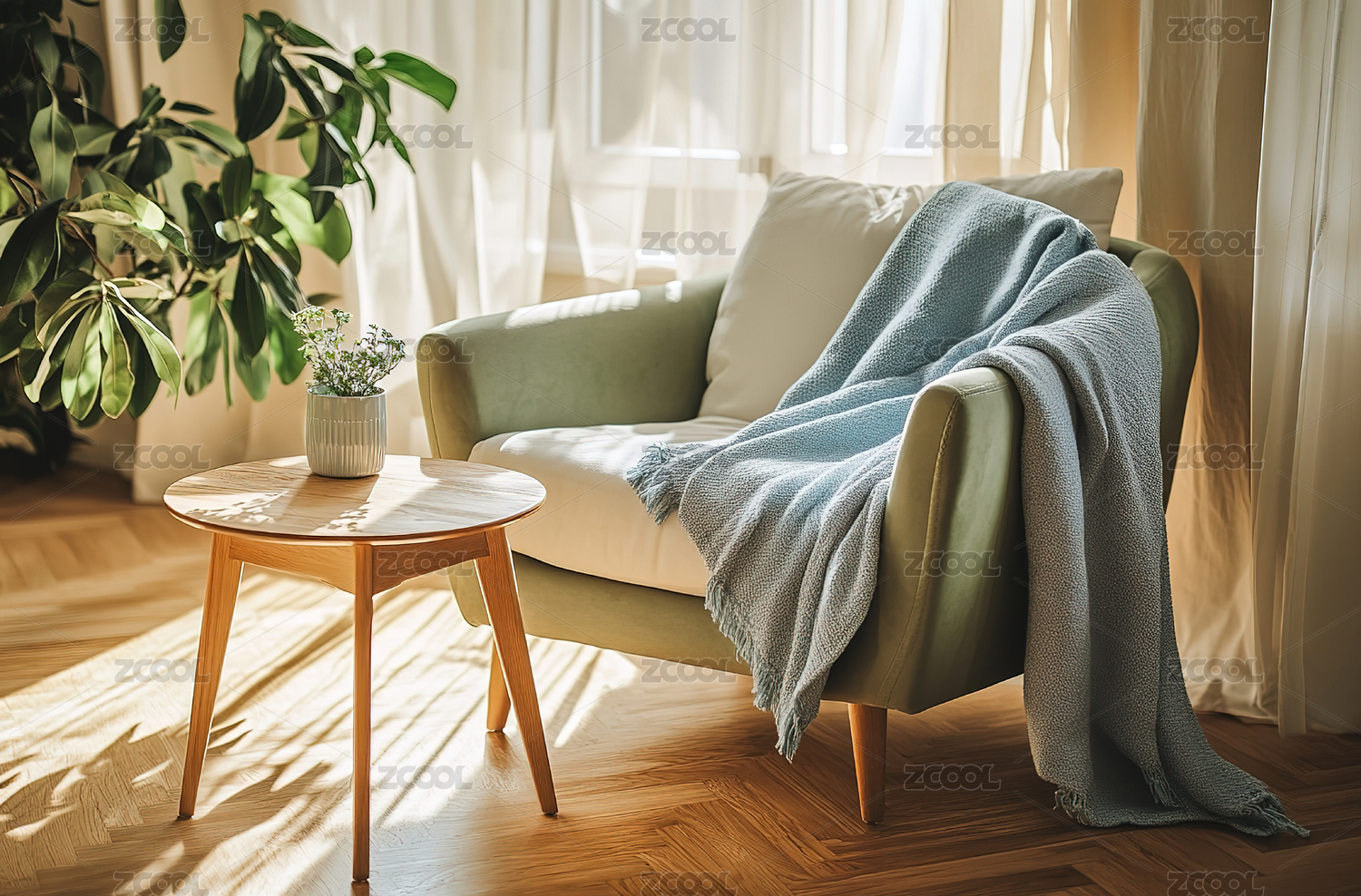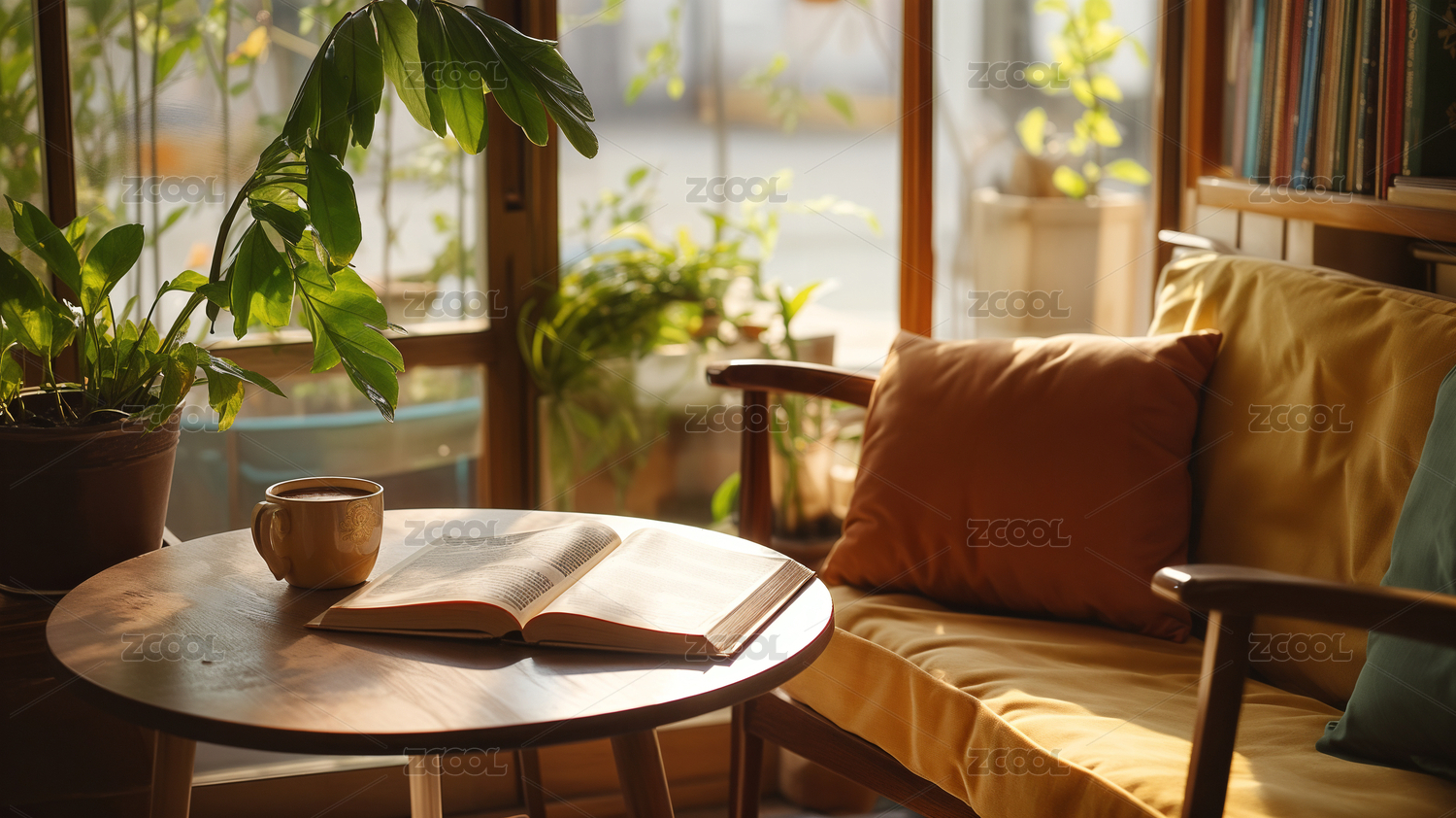 明亮的起居室内一本书和一个咖啡杯放在绿色金属边桌上