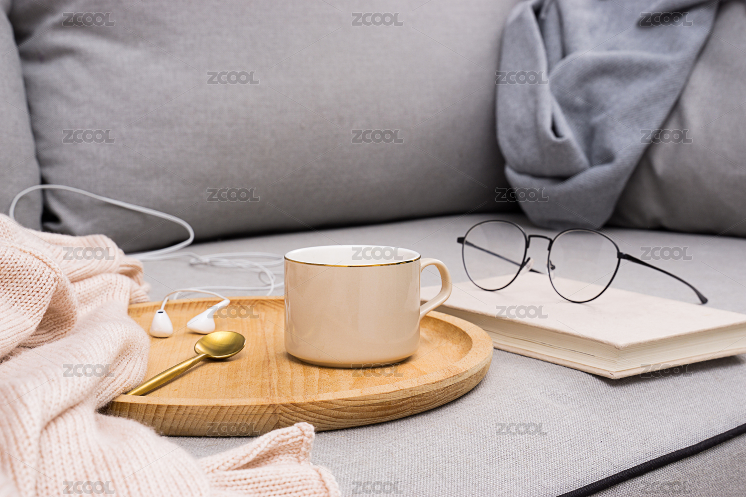 放在灰色双人沙发上的粉色毛衣,咖啡杯与书籍