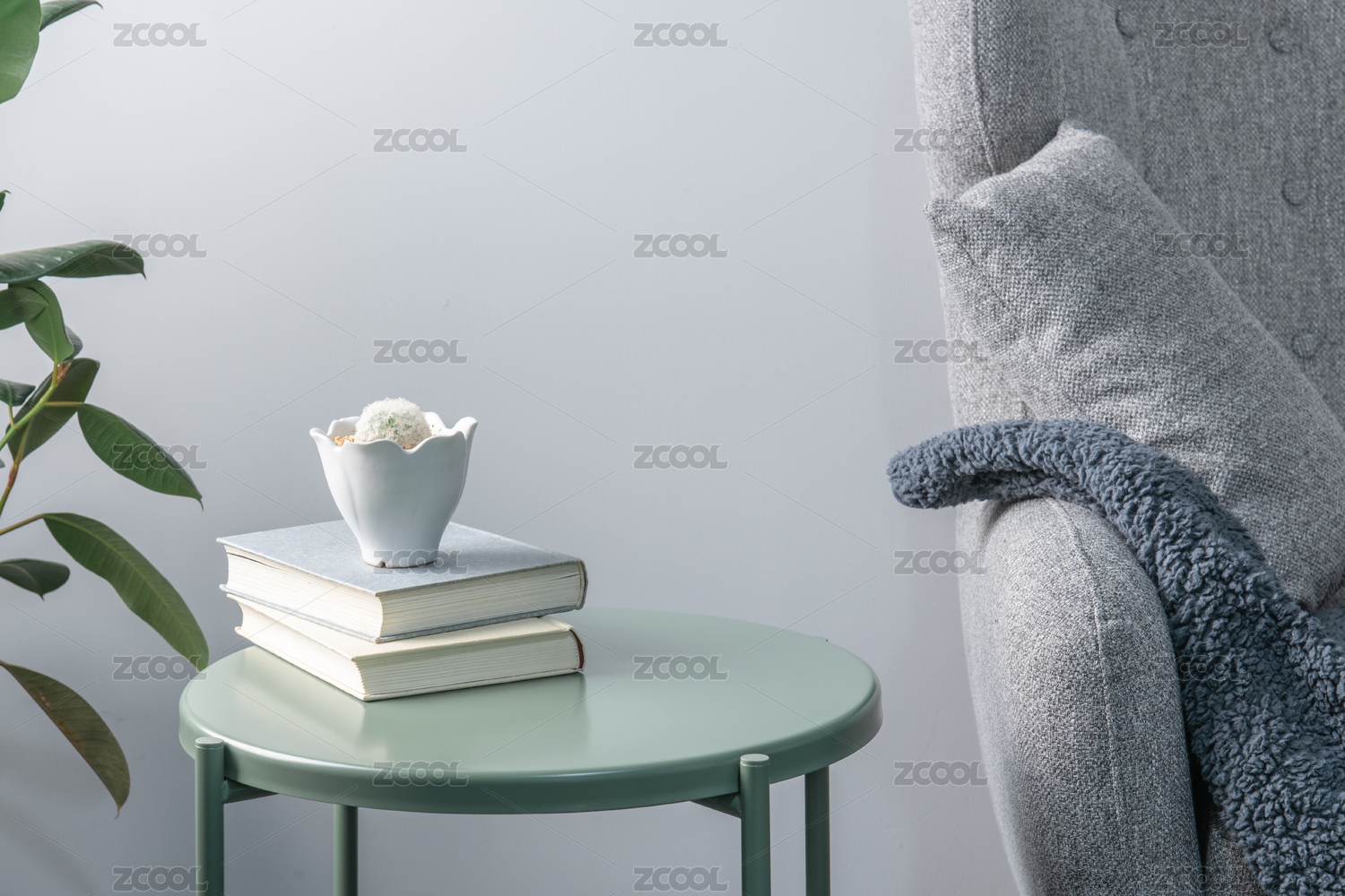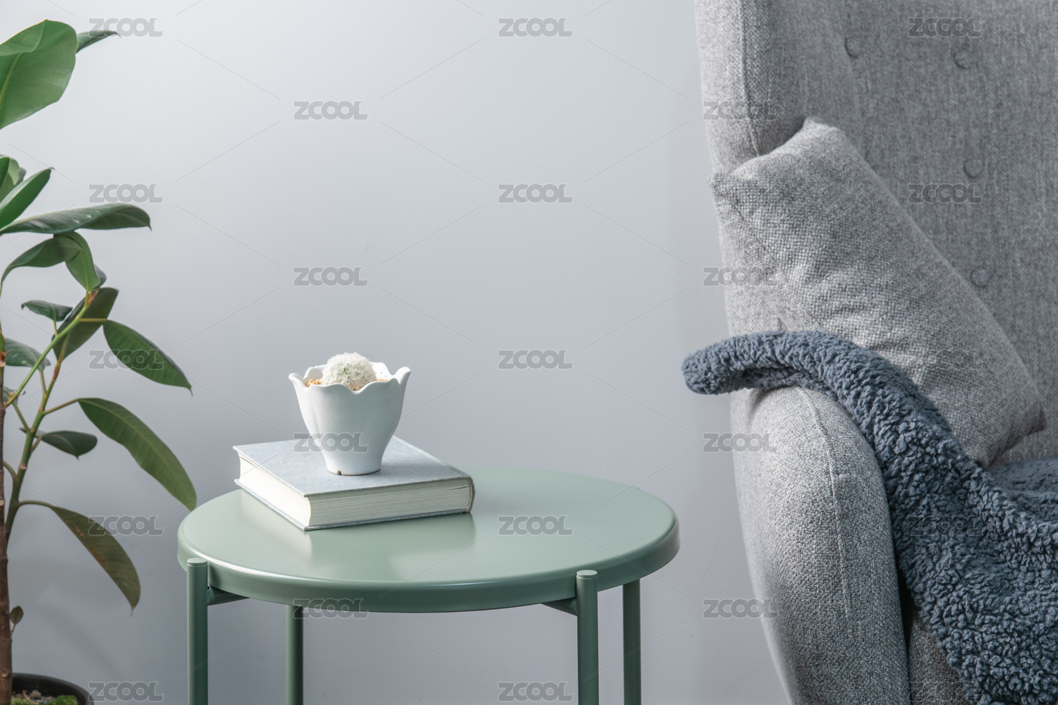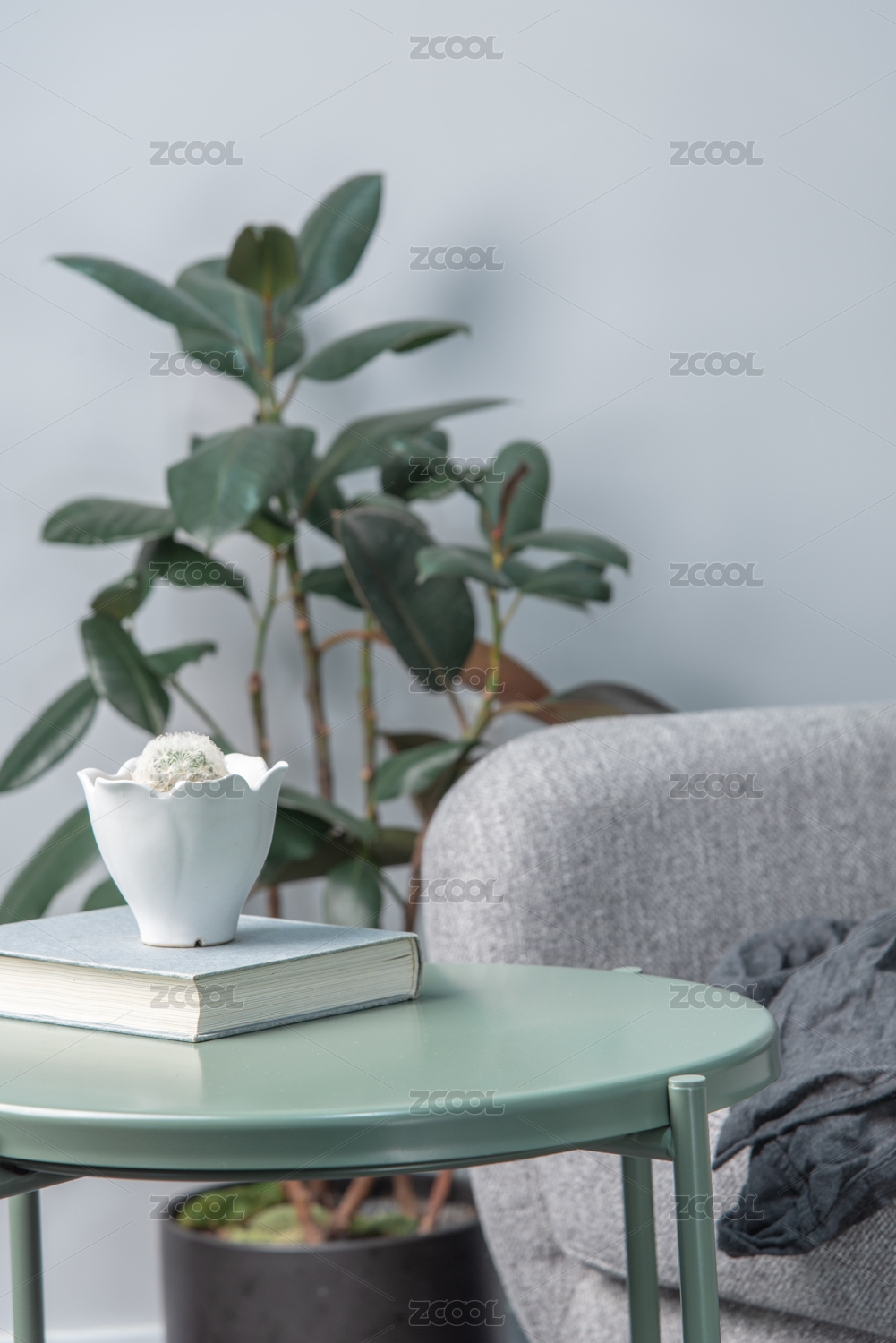明亮的起居室内一本书和一盆仙人球放在绿色金属边桌上