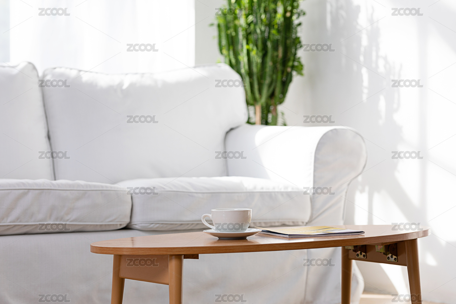 灰色沙发前放在白色桌面上的白色牛奶杯与咖啡杯