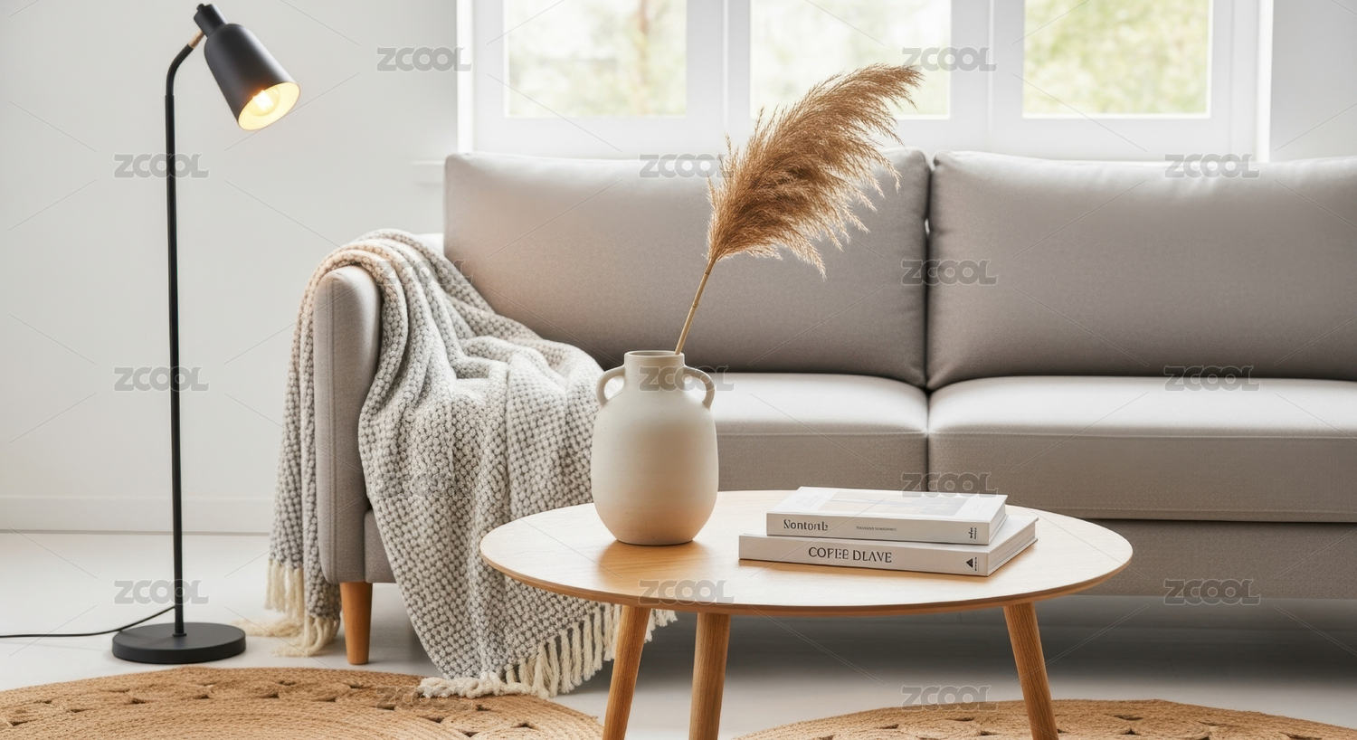 带灰绿色金属边桌和灰色布艺沙发的明亮起居室内部场景