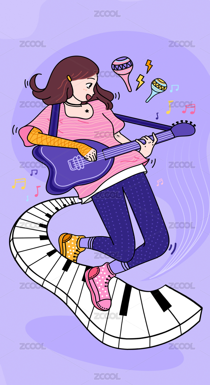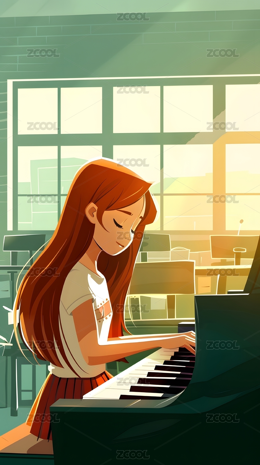 穿裙子的女孩坐着弹钢琴 可爱风格国际音乐日插画