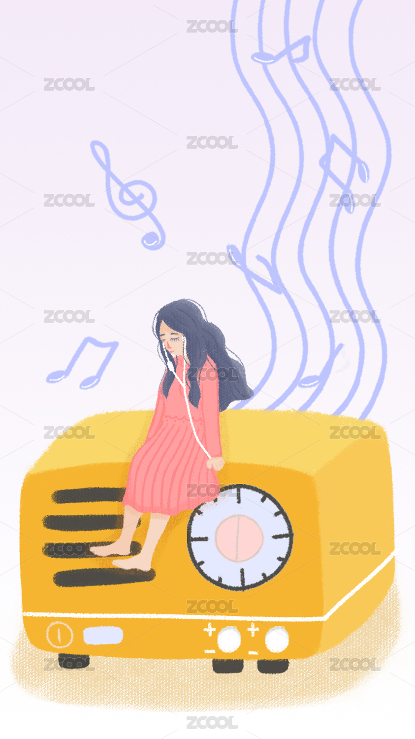 女孩坐在复古音响上听歌音乐扁平治愈插画