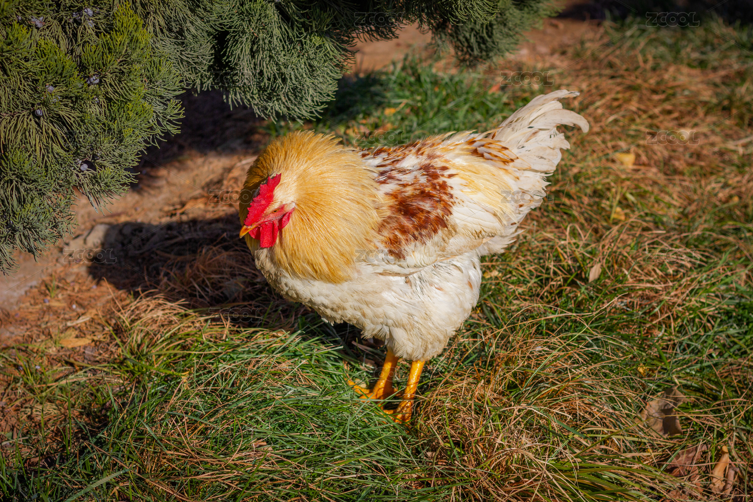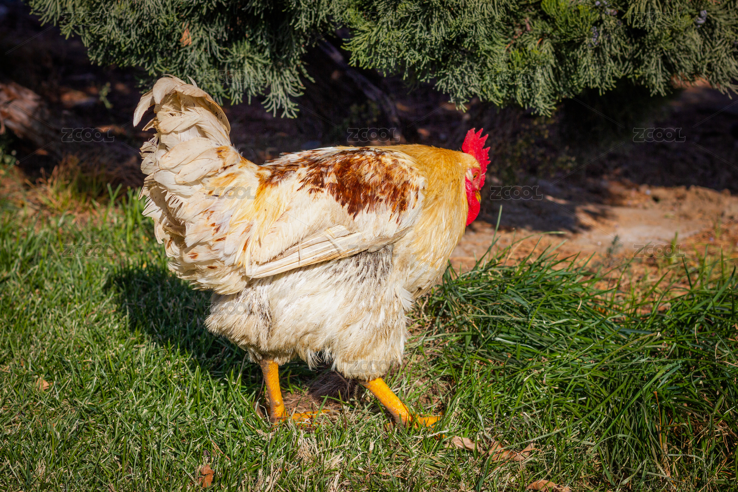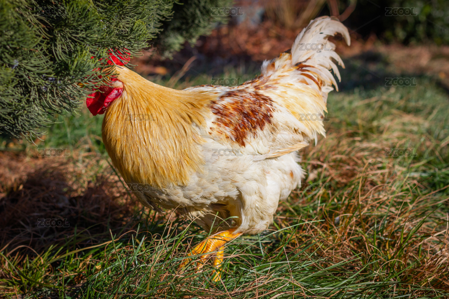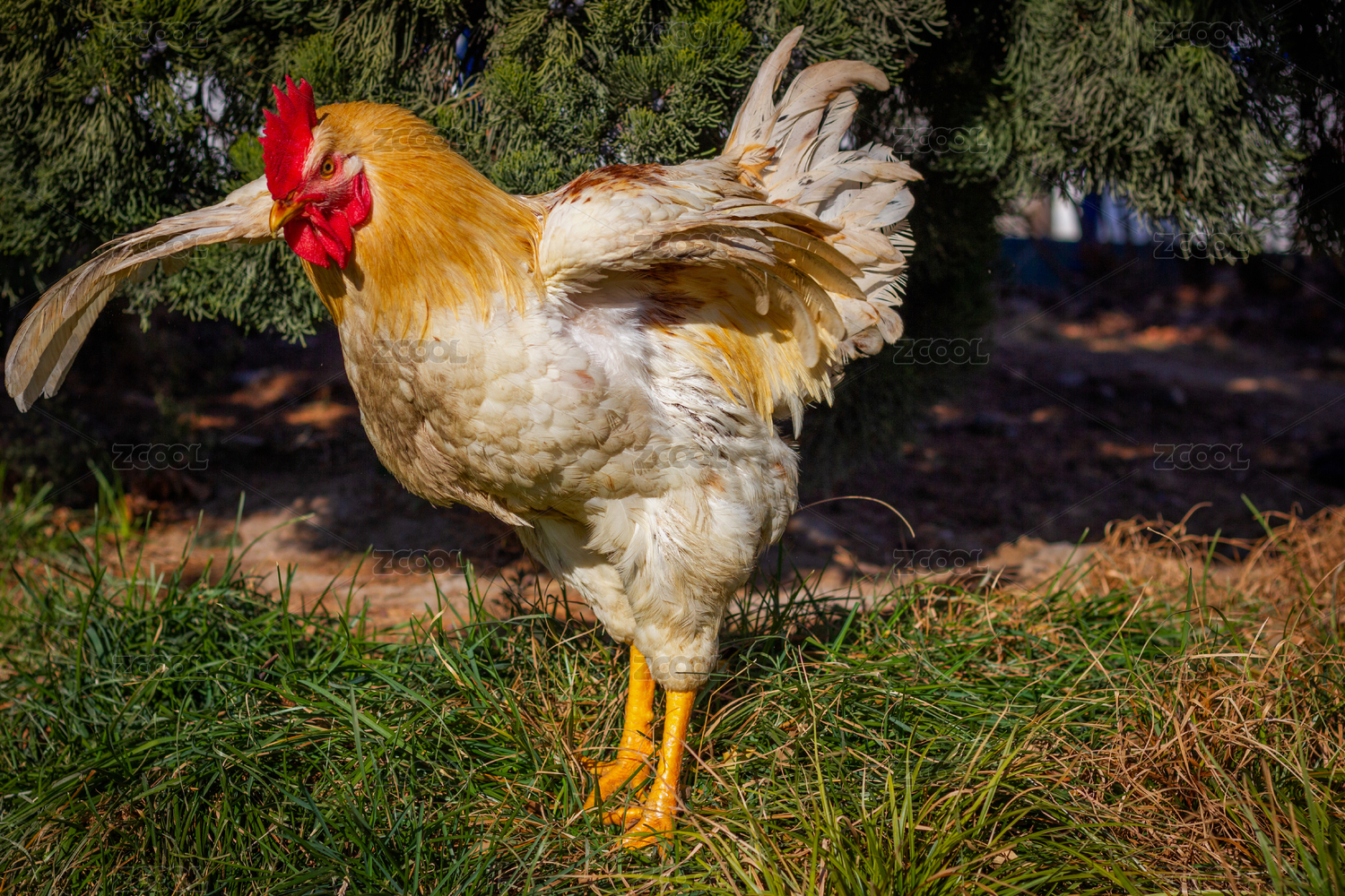 鸡,公鸡,家畜,黄色,羽毛,鸡冠,红色,草地,觅食,喙