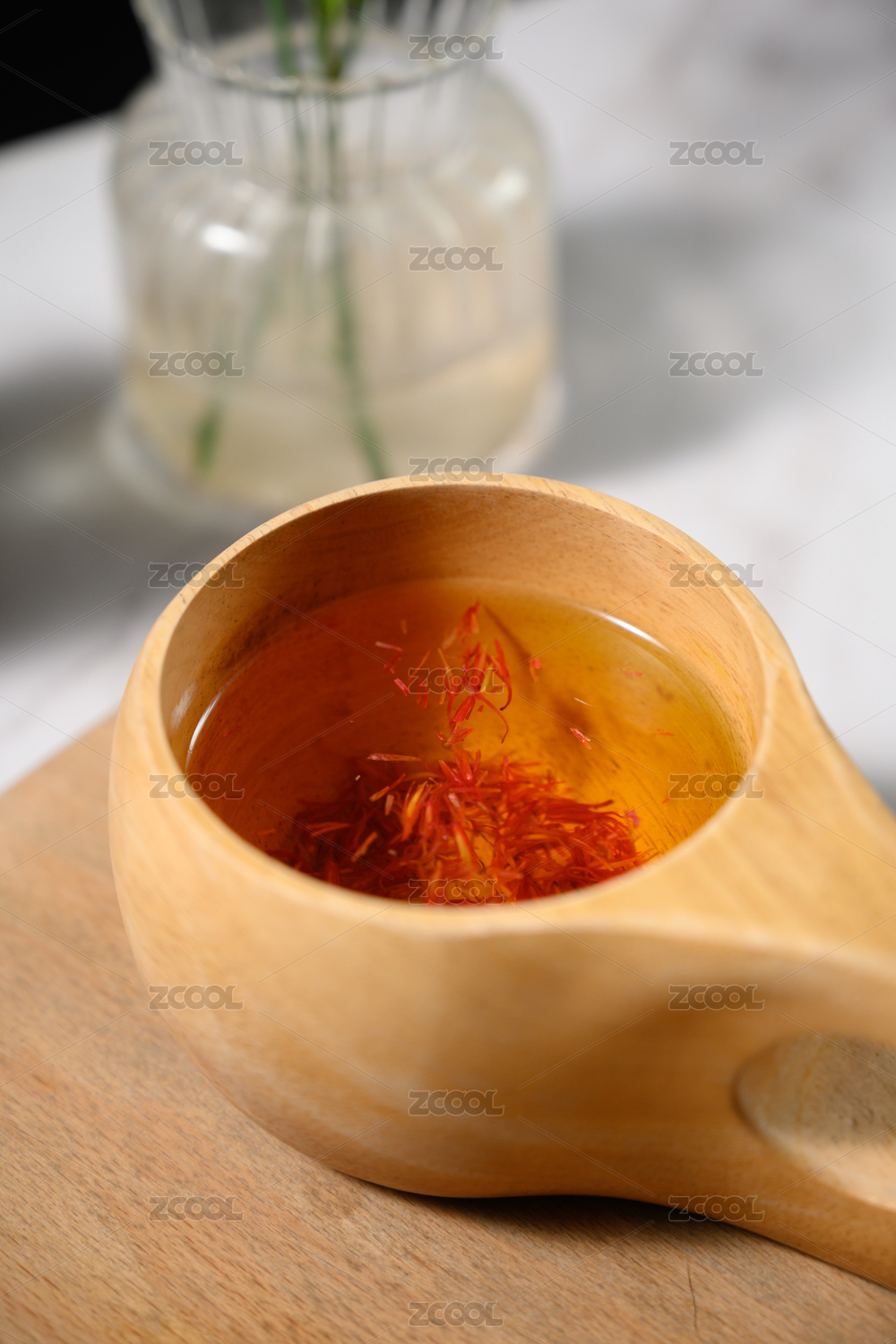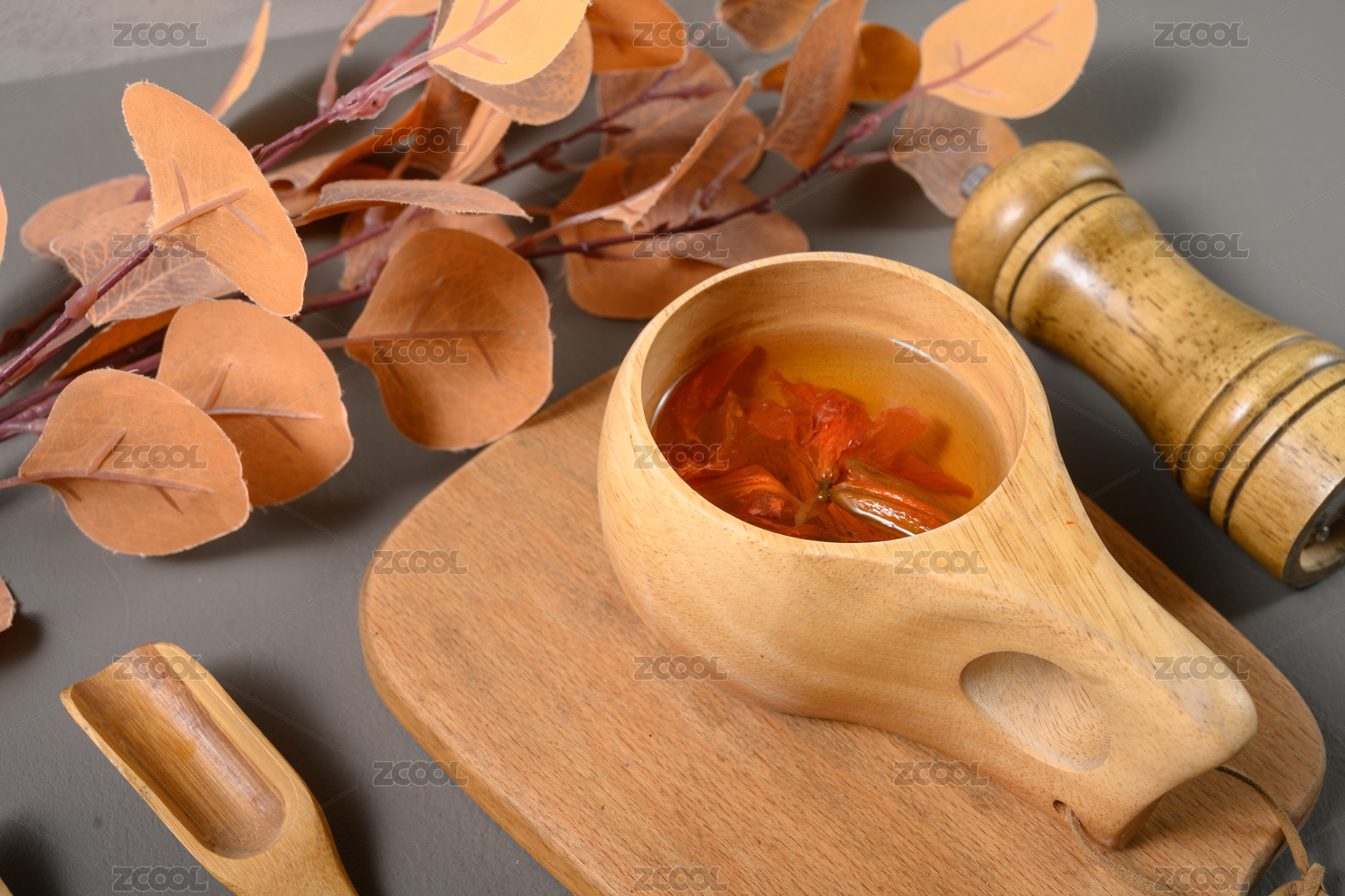 桌面上的杯子里的甘甜可口的山茱萸茶