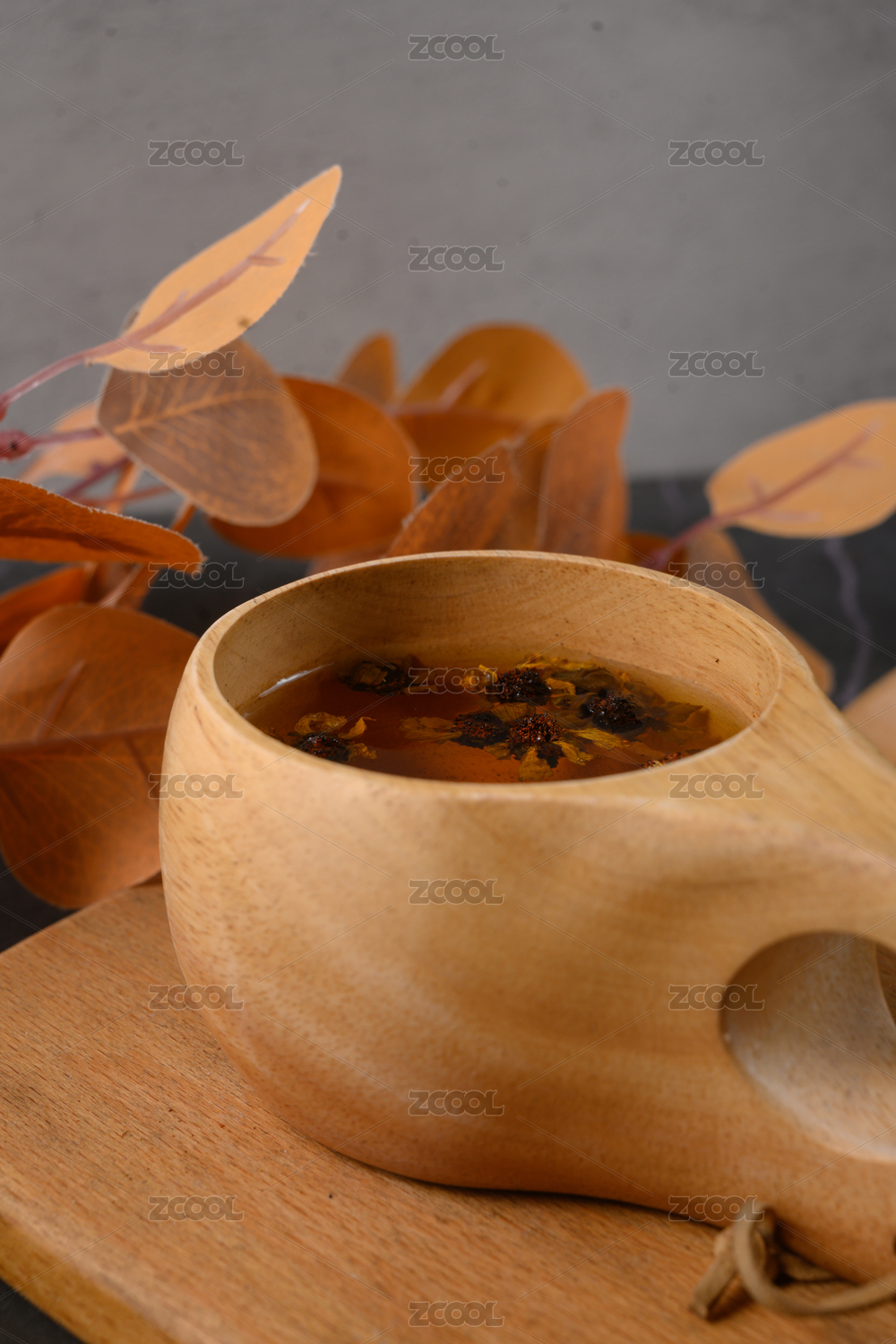 桌面上的杯子里的甘甜可口的胰岛果茶