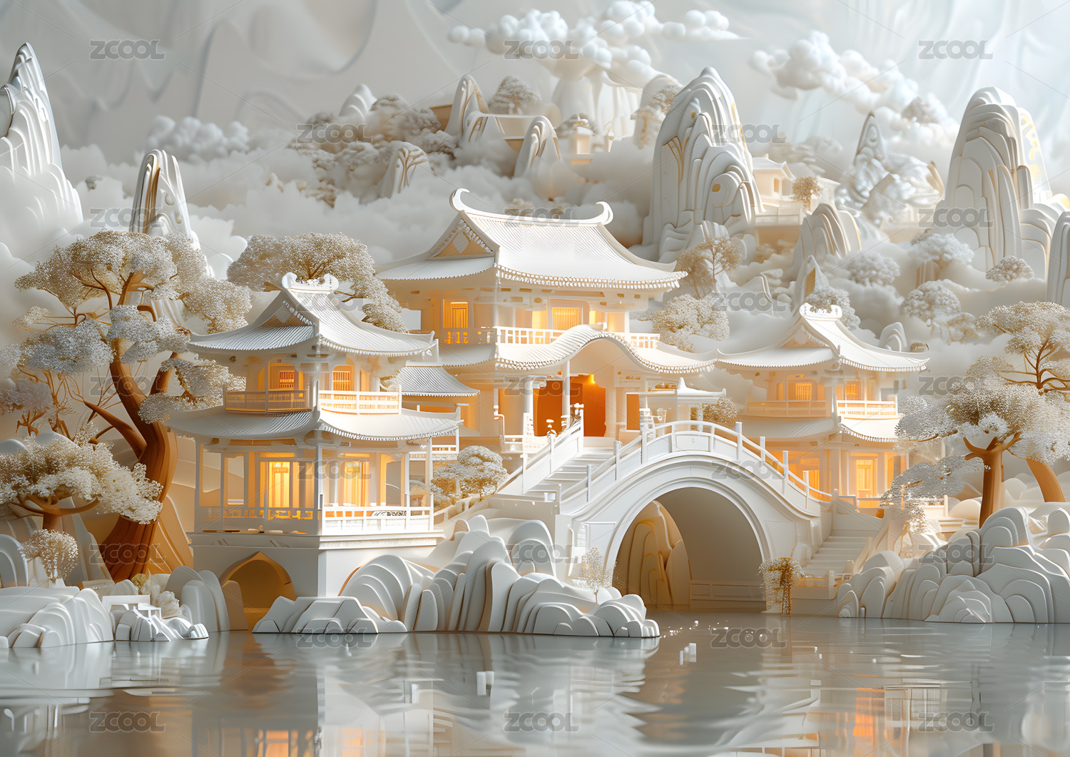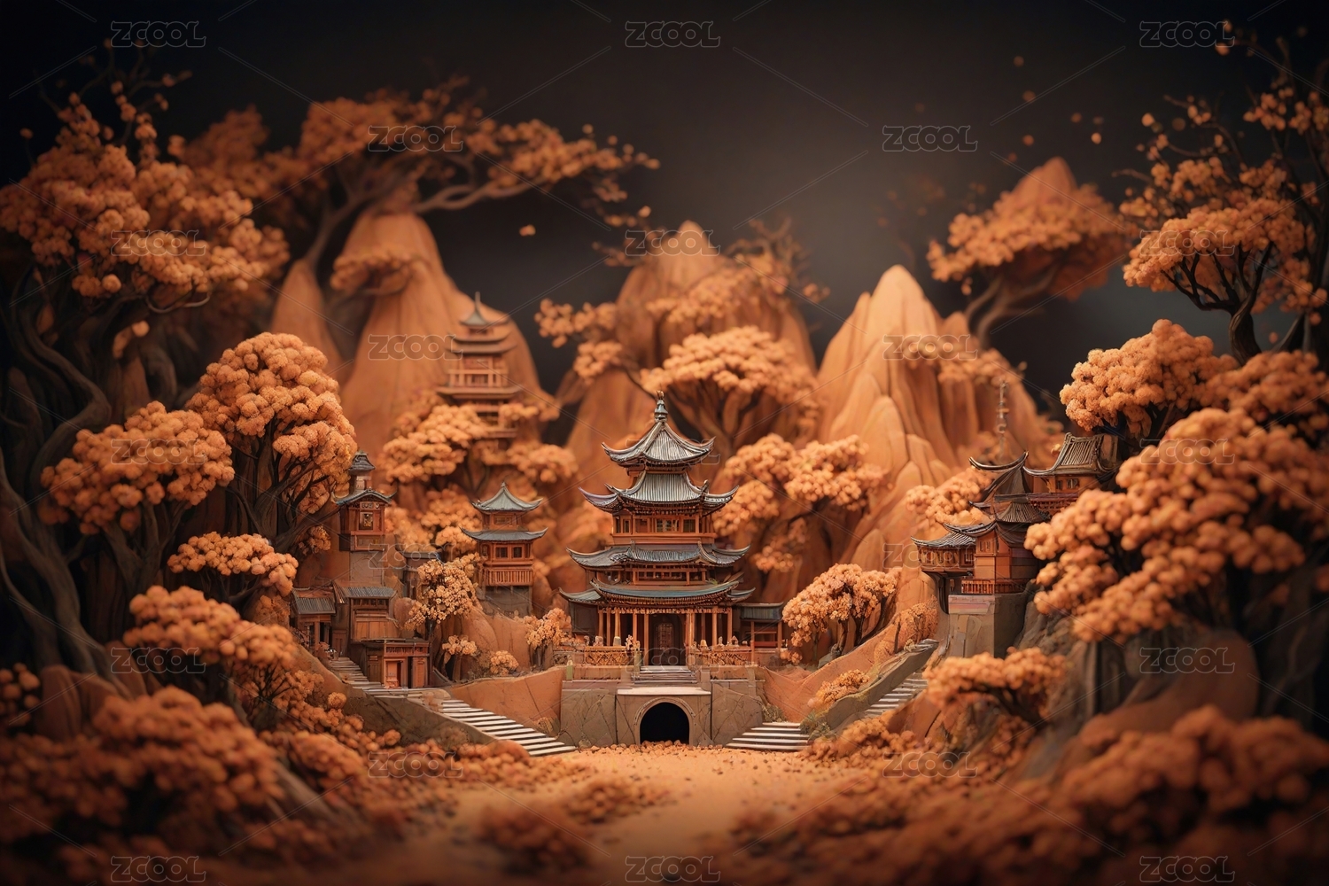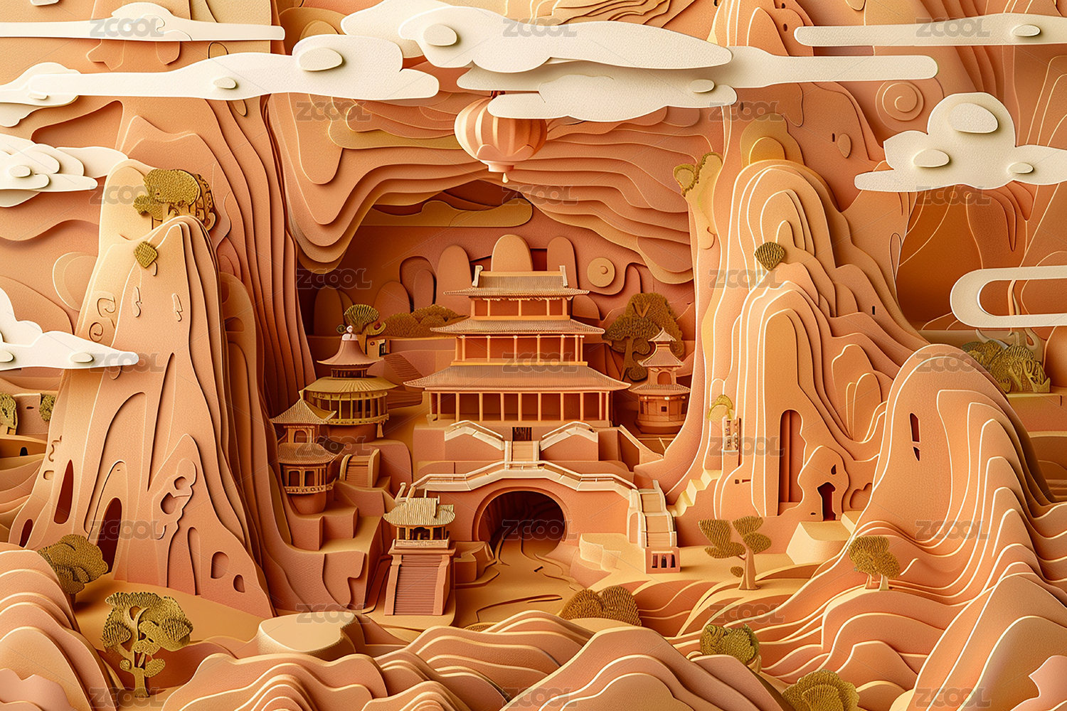 剪纸,中国风,插画,山水画,春节,剪切或撕裂纸张,建筑结构,亭台楼阁,AI数字艺术,装饰