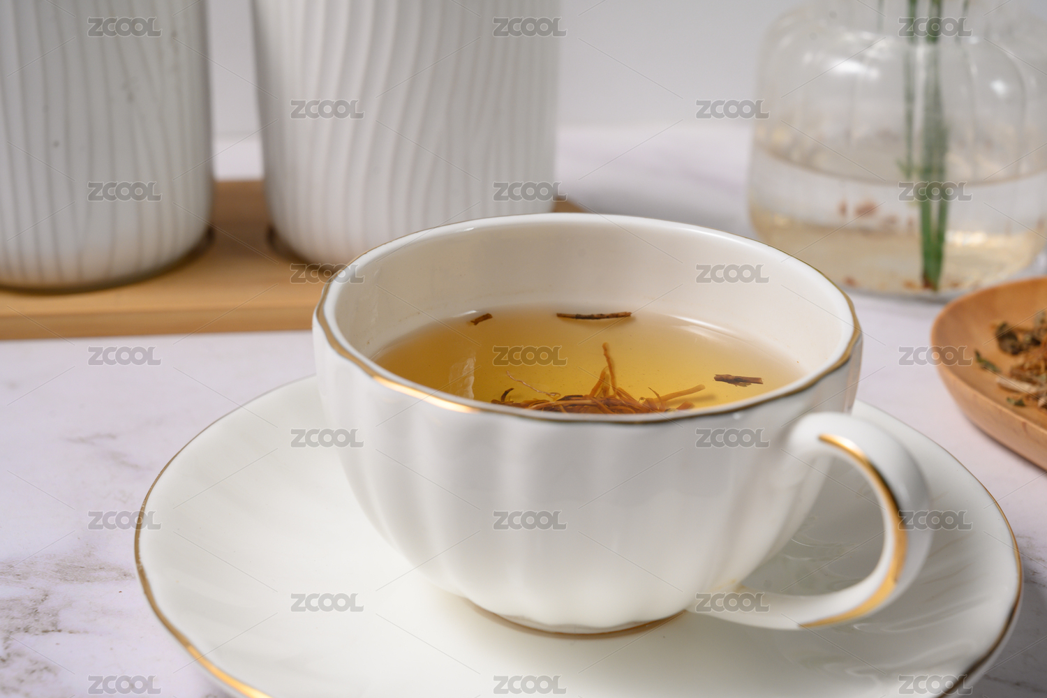 桌面上个的杯子里的甘甜可口的龙胆草茶