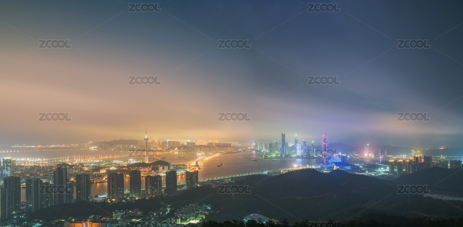 中国广东省珠海市俯瞰珠海和澳门两地城市建筑和风光