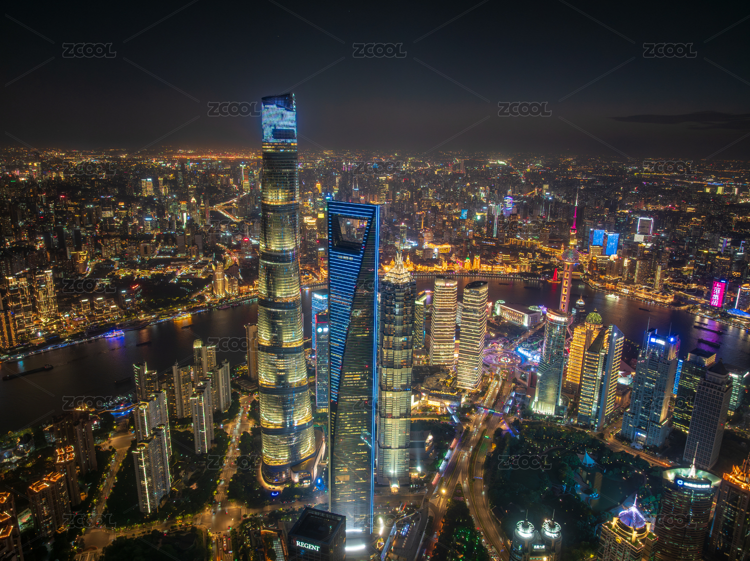 航拍中国上海浦东新区夜景全景、黄浦江与四件套