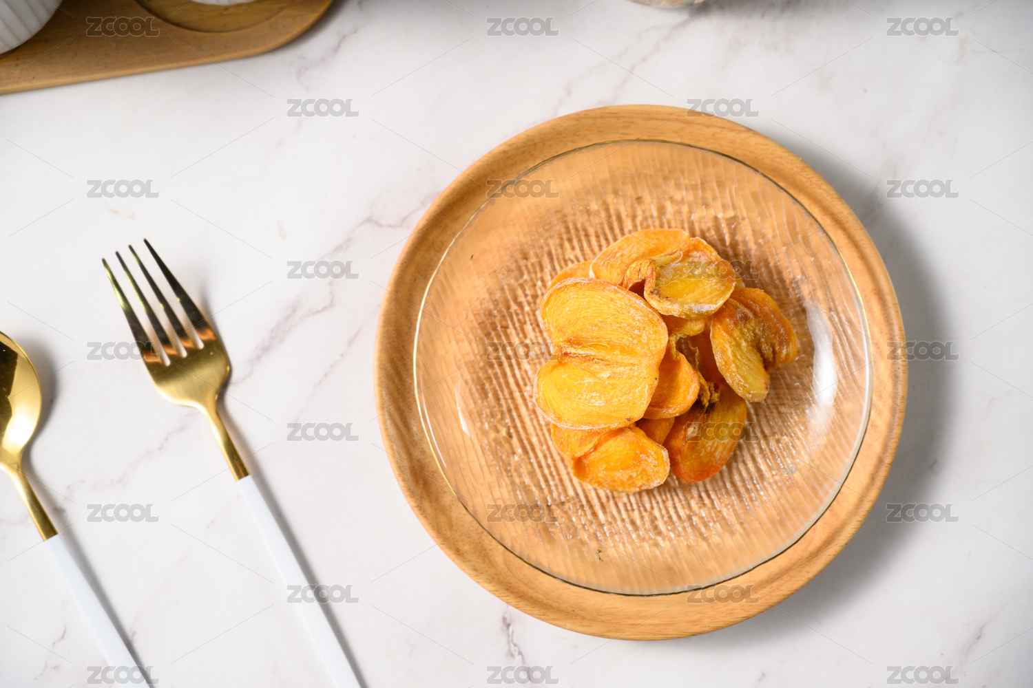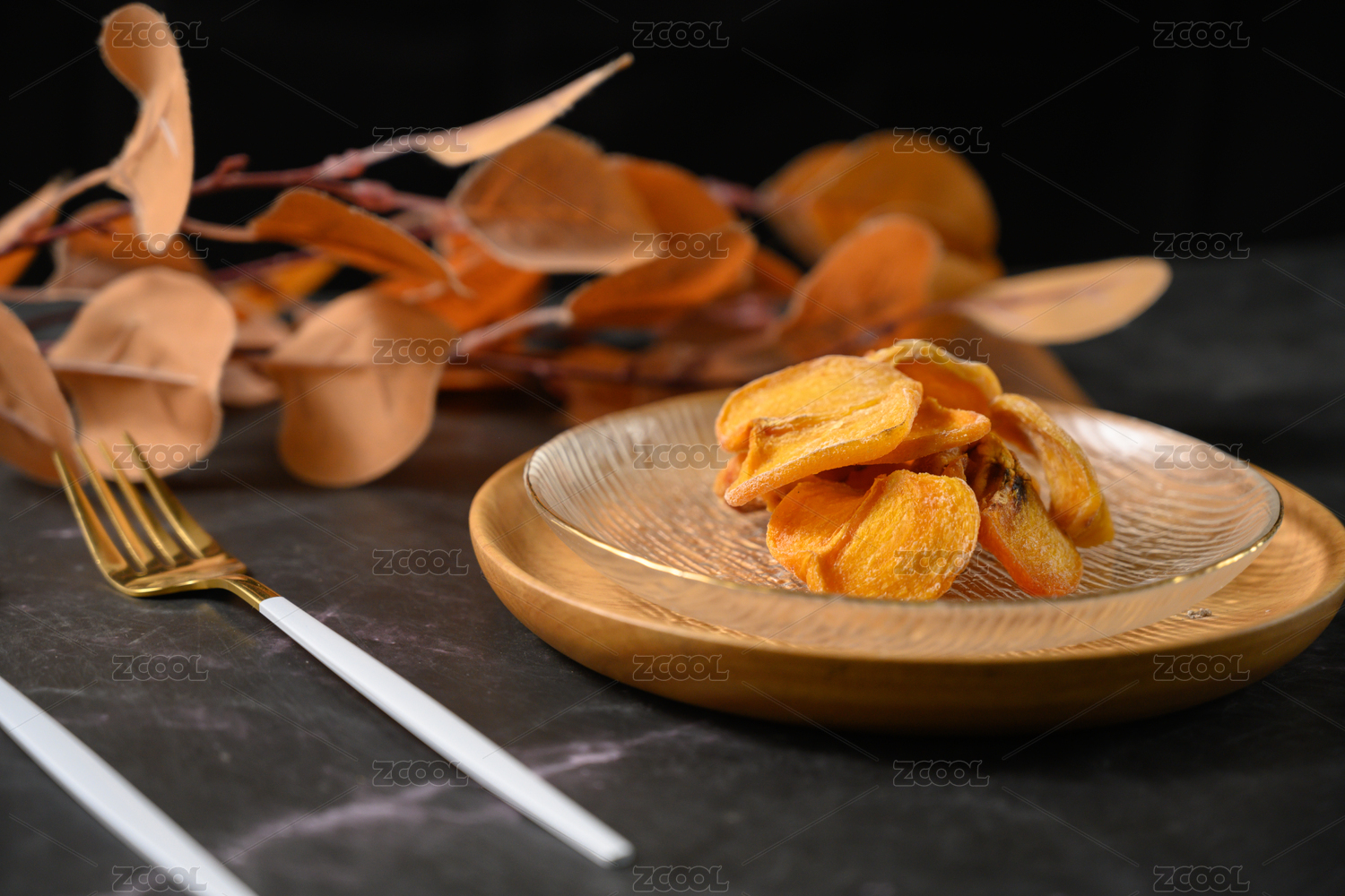 桌面上的盘子里的美味可口的柿子干