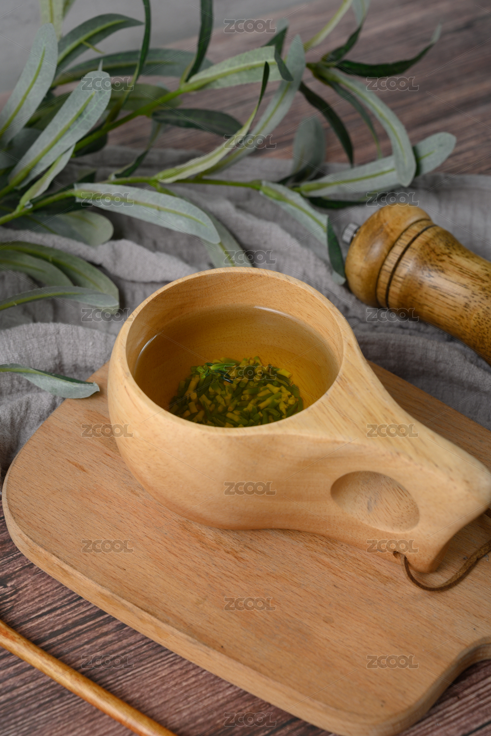 桌面上的杯子里的甘甜可口的油甘叶茶