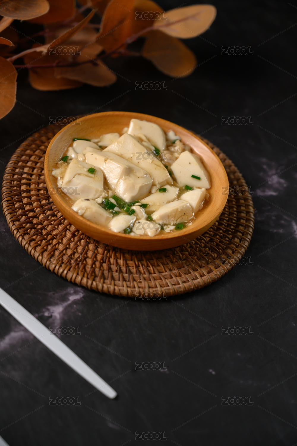 桌面上的盘子里的美味可口的小葱拌豆腐