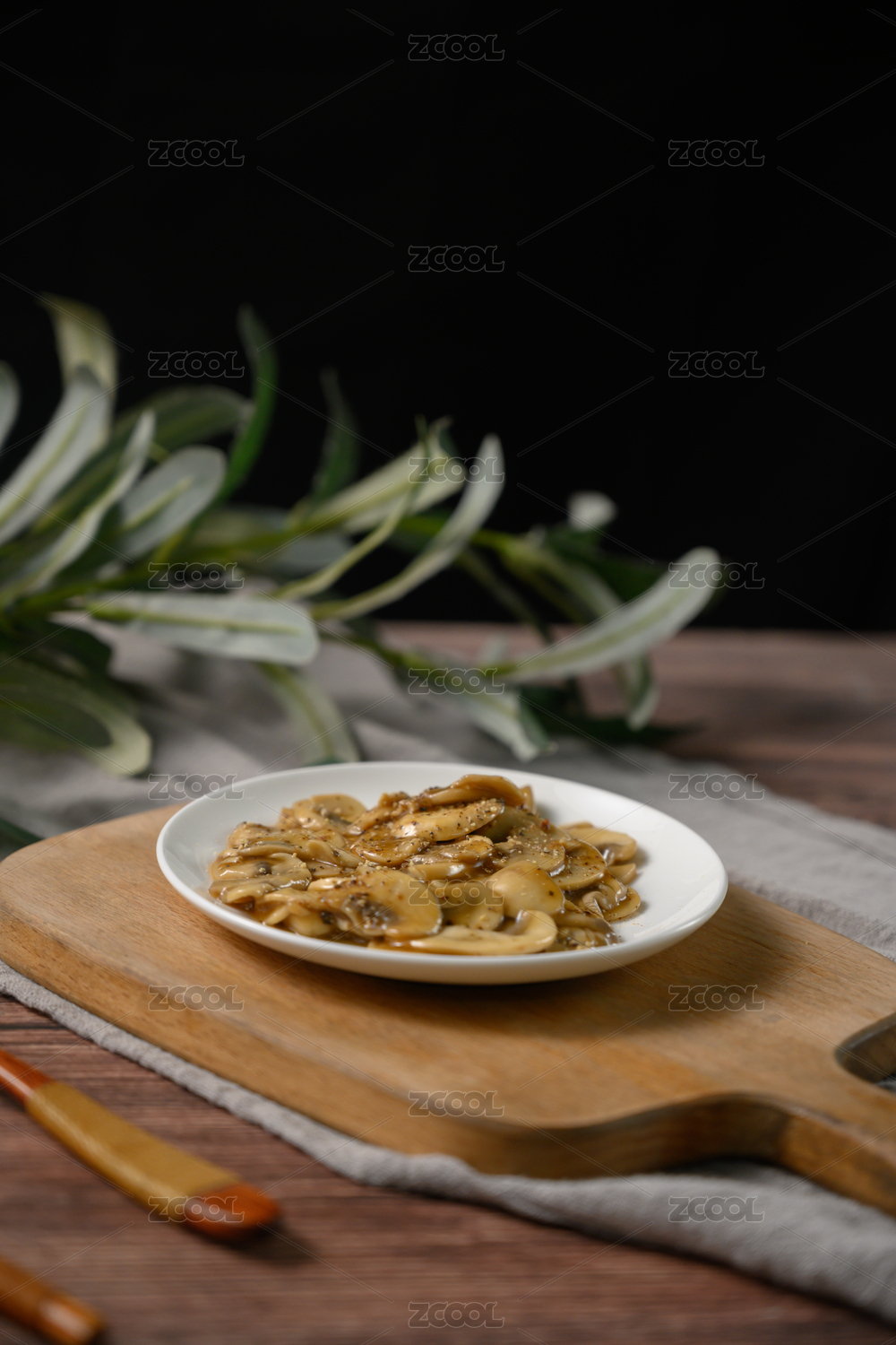 桌面上的盘子里的美味可口的黑椒蘑菇