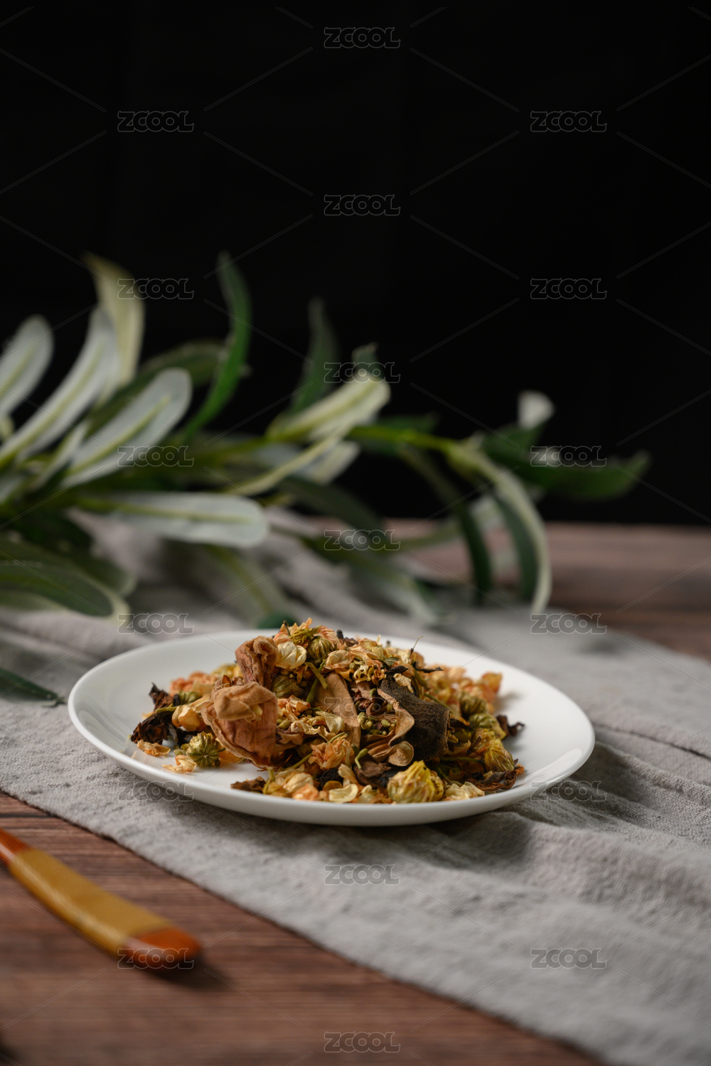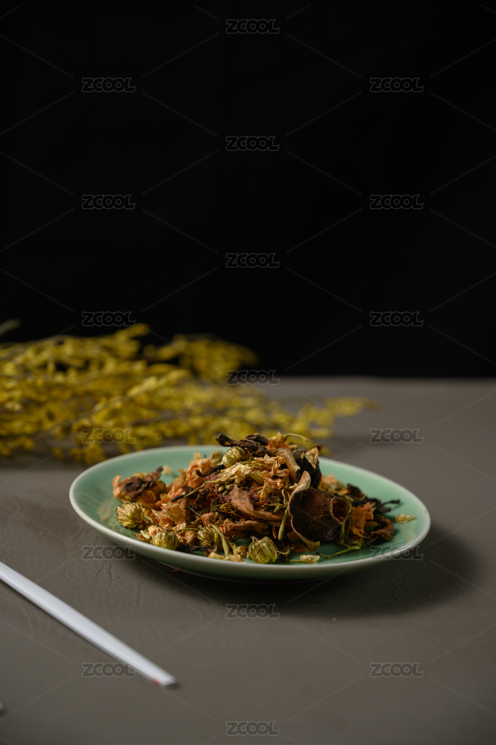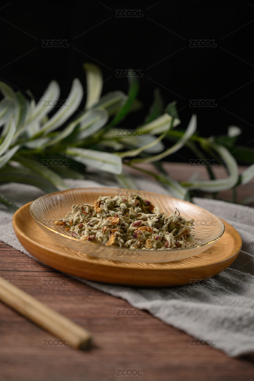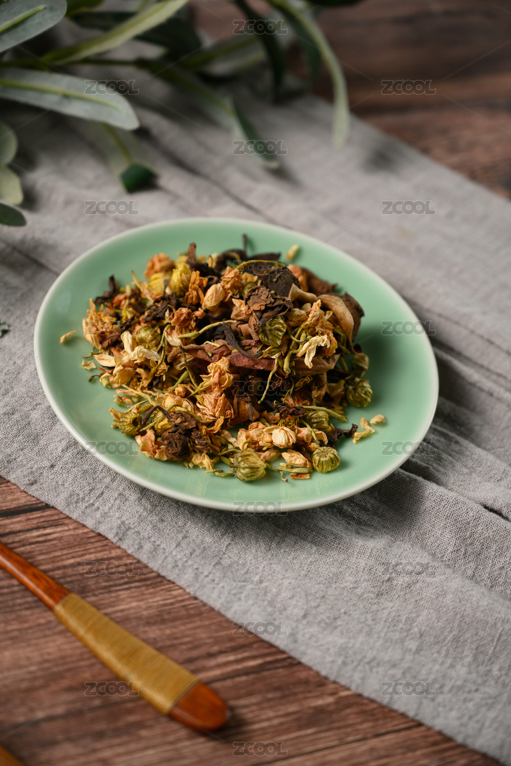 桌面上的盘子里的干爽的花草茶