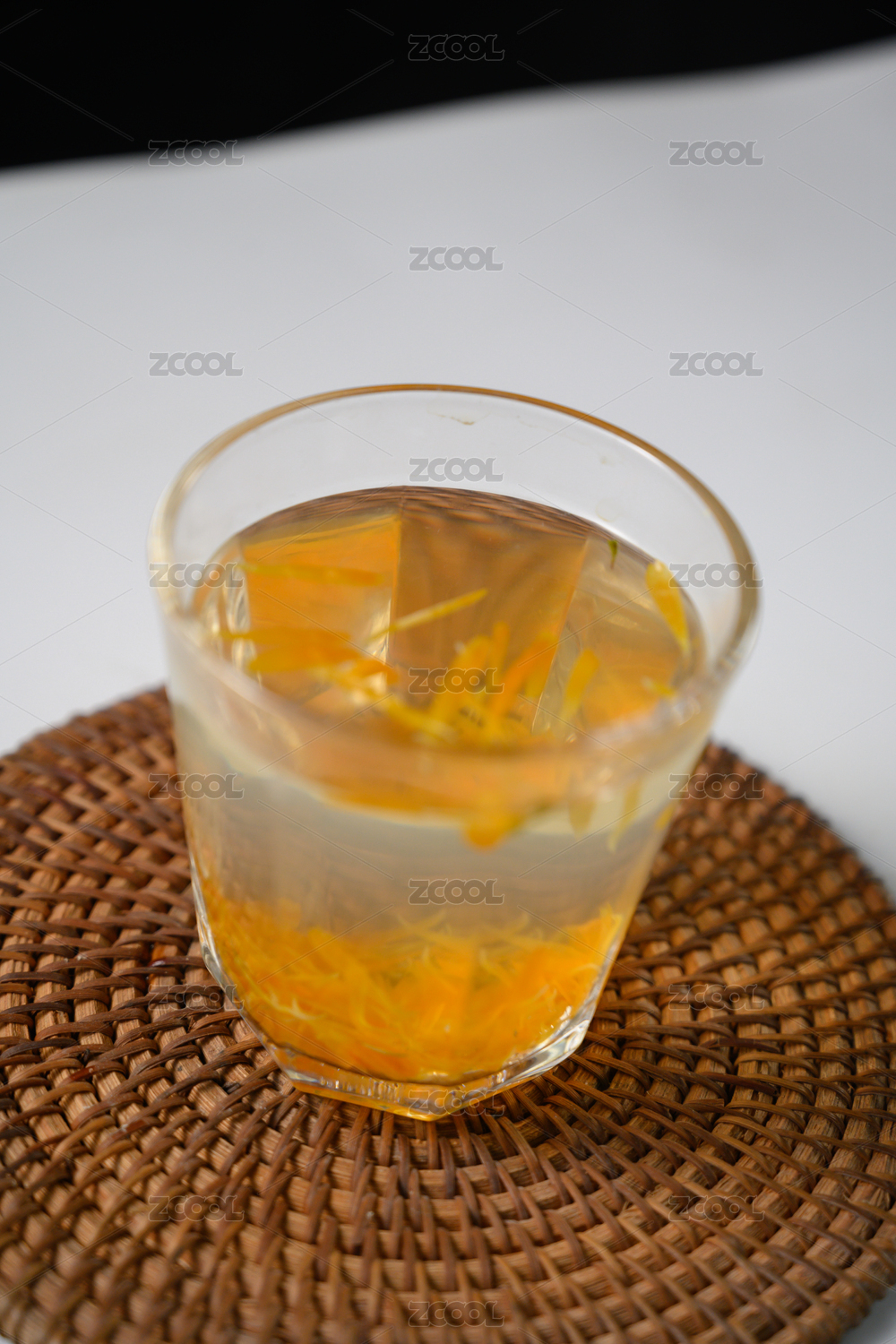 桌面上的杯子里的甘甜可口的金盏菊花茶