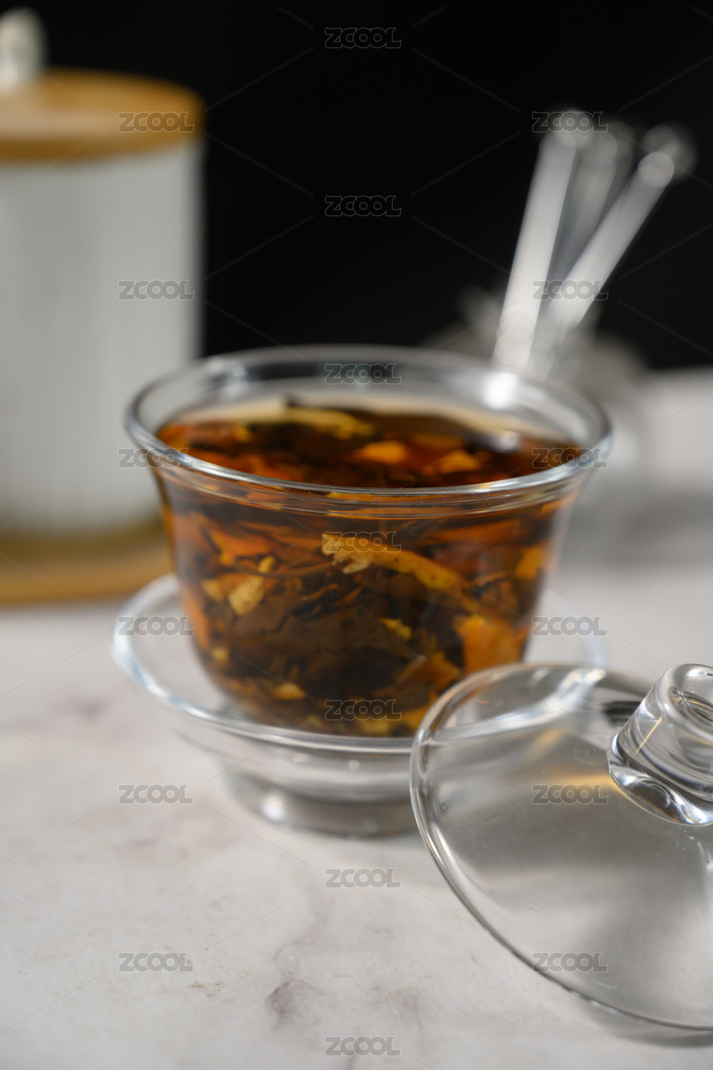 桌面上的杯子里的甘甜可口的陈皮白茶