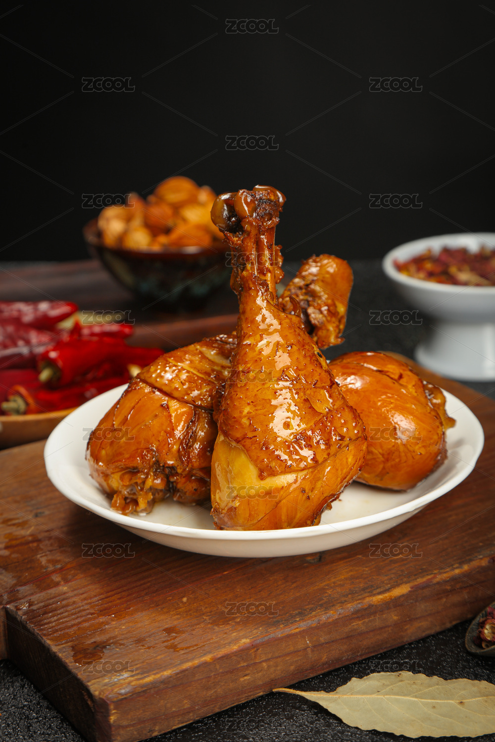 木底上放着一盘腌制过的鸡腿和手上拿着鸡腿