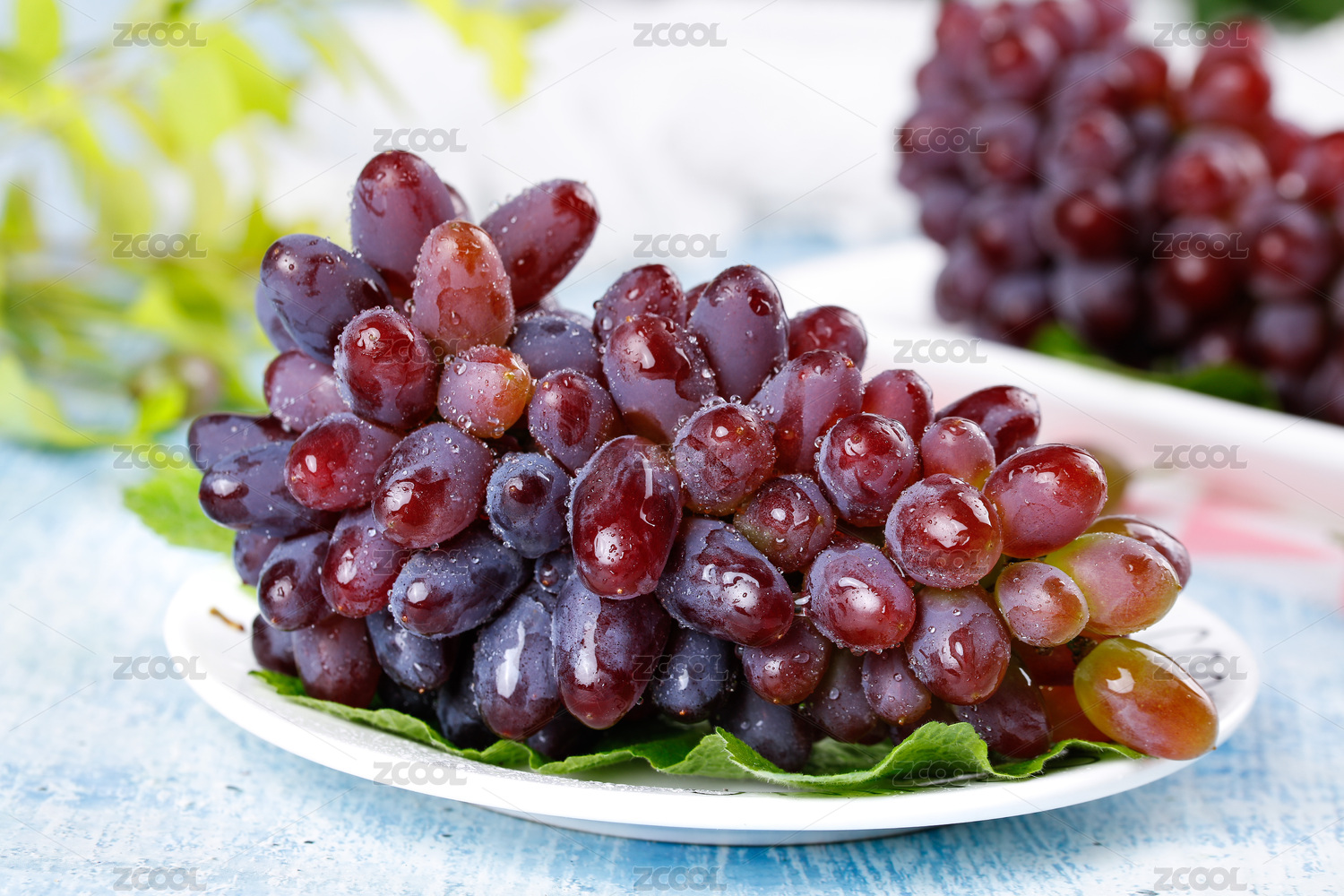 白底上放着无籽红提