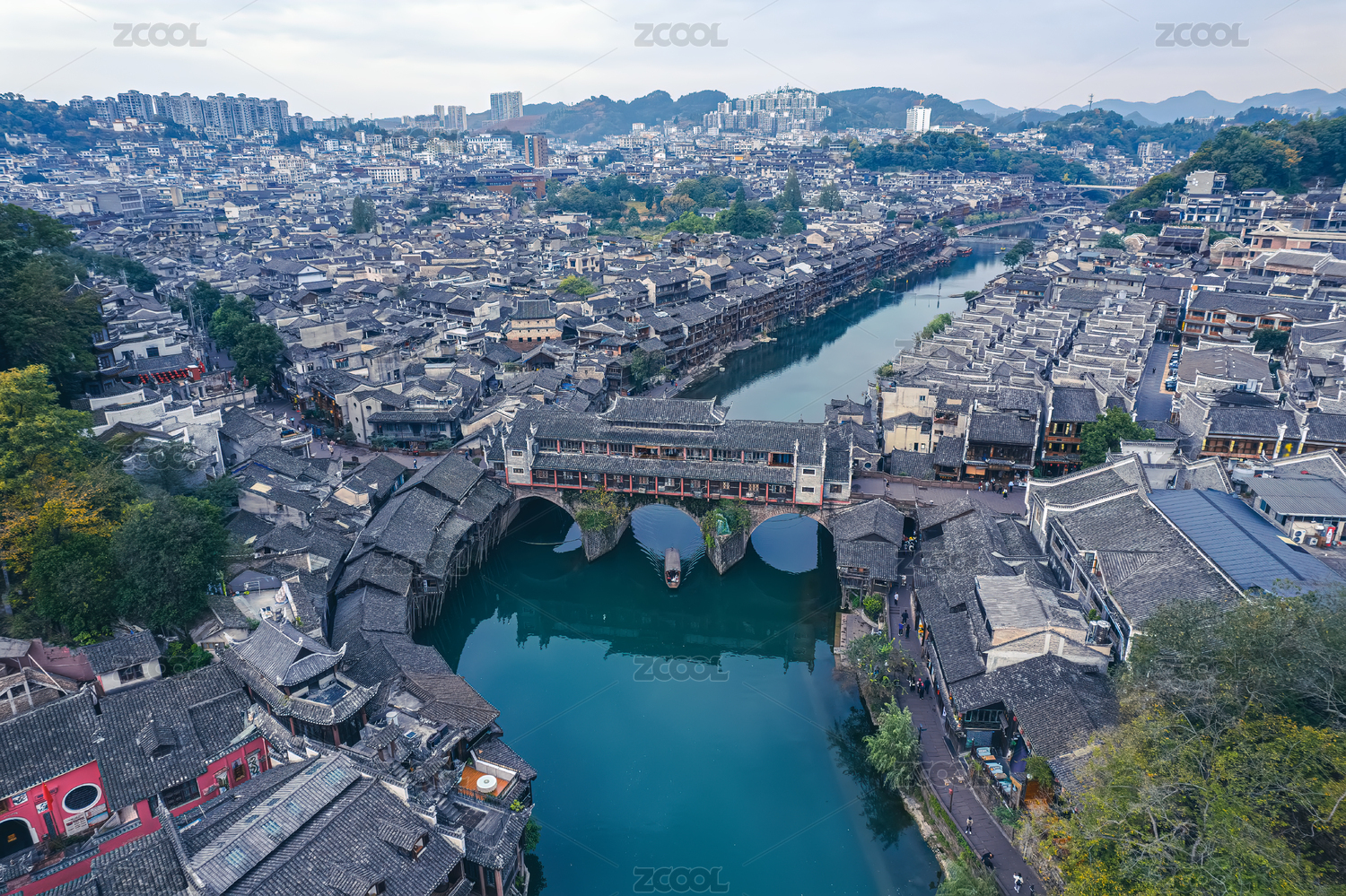 湖南湘西凤凰古城,古镇水乡航拍全景