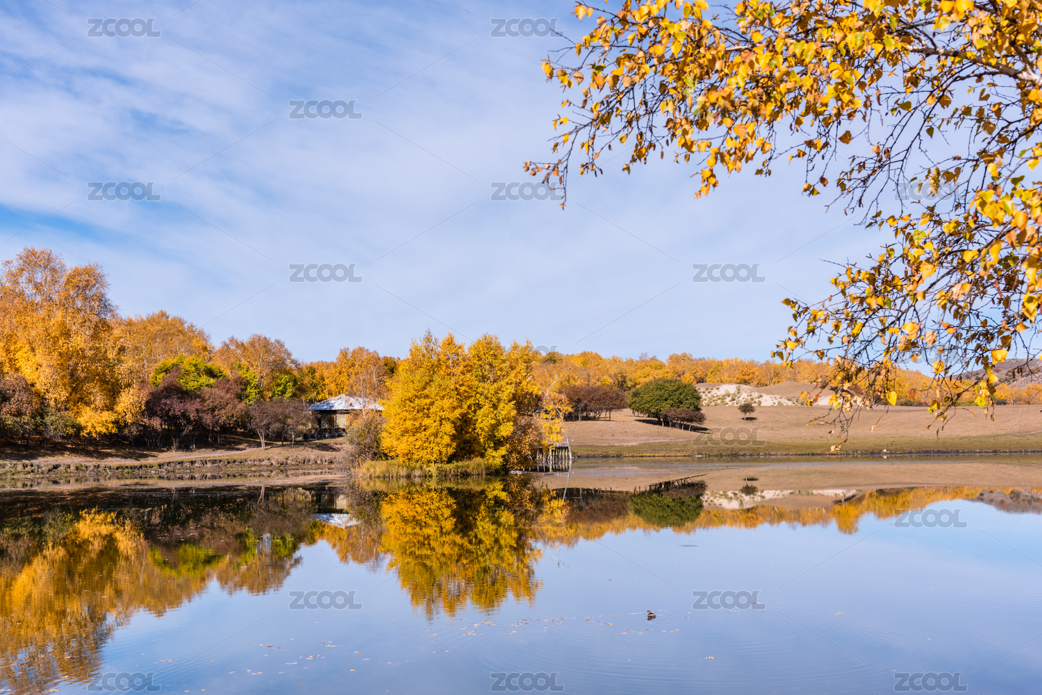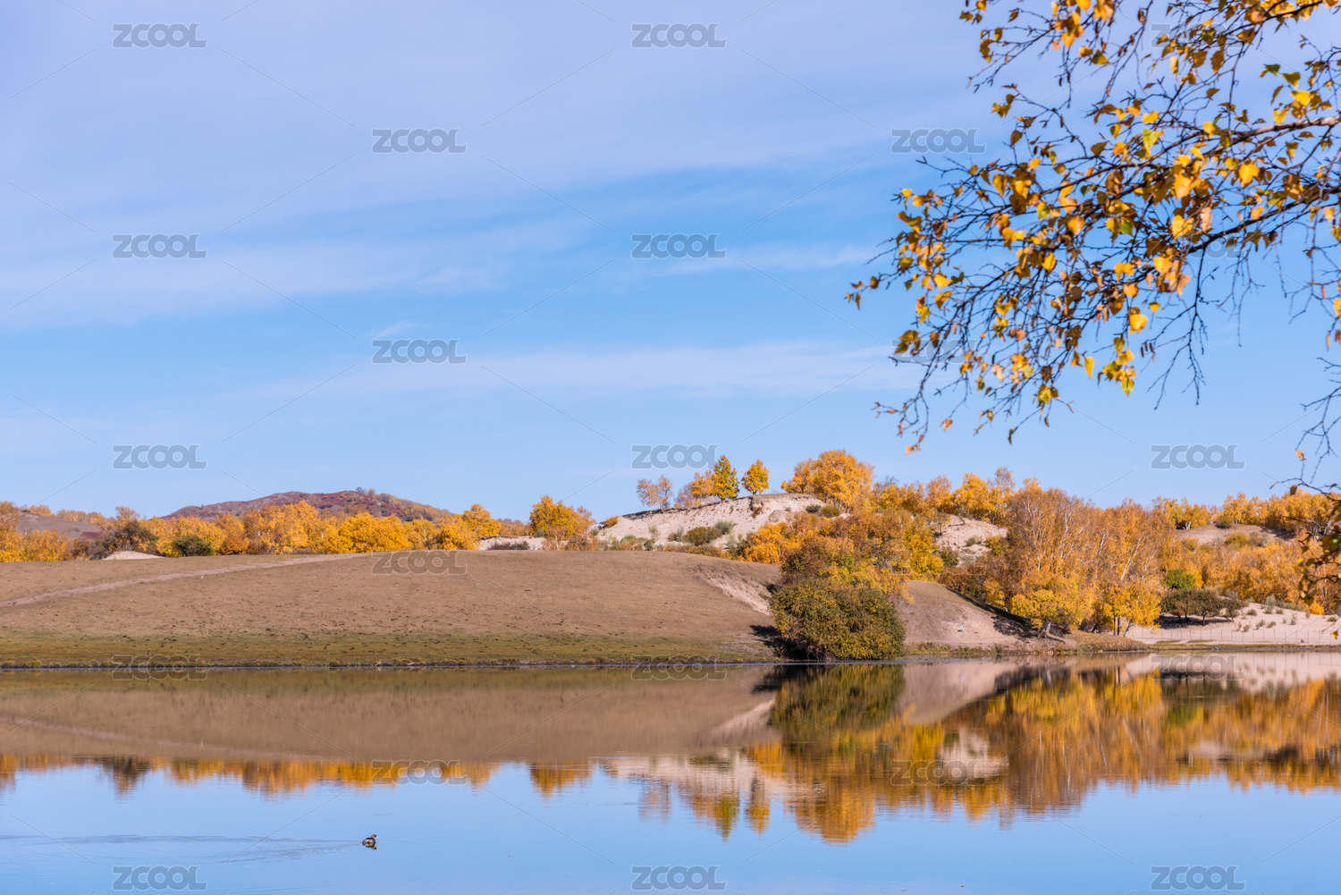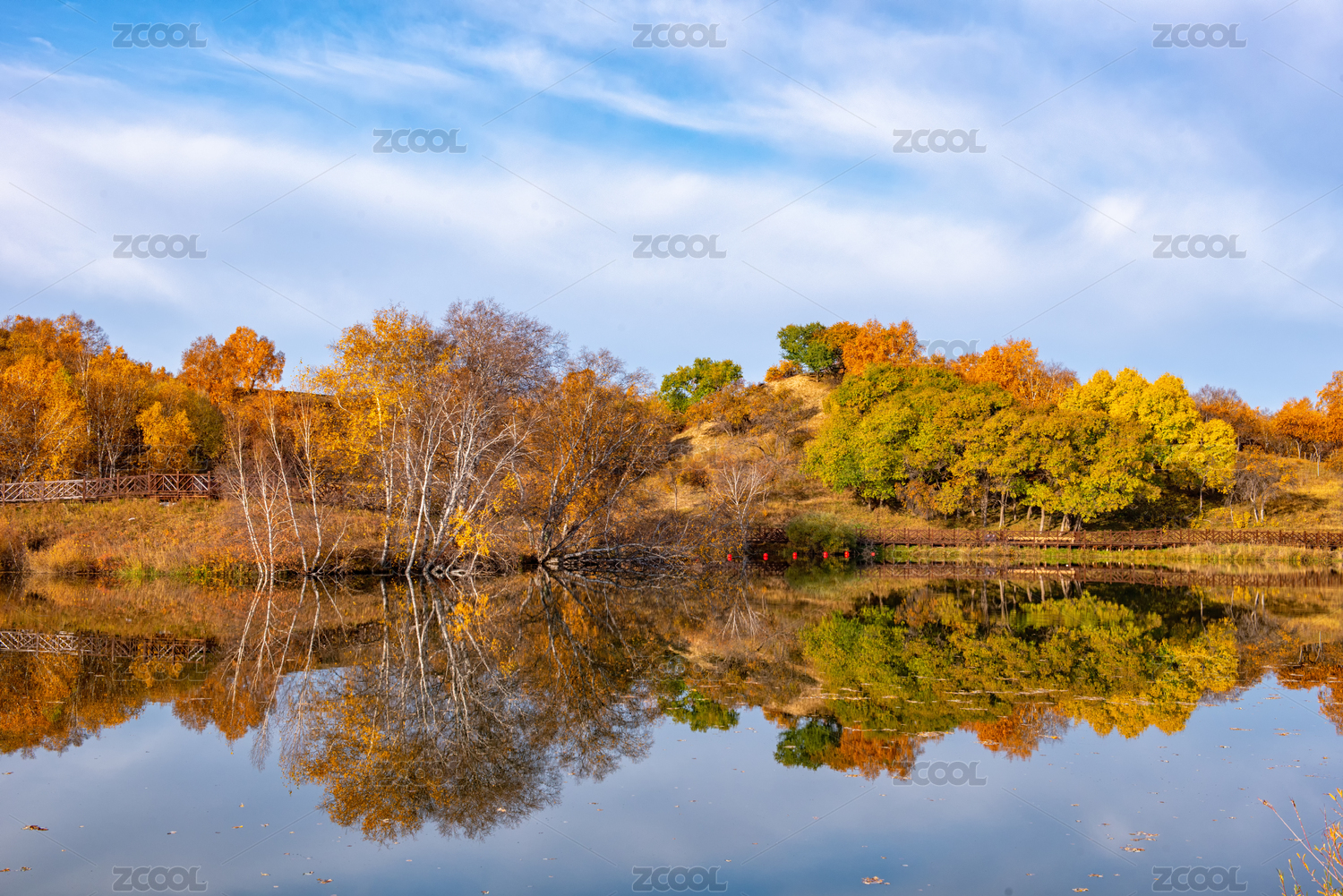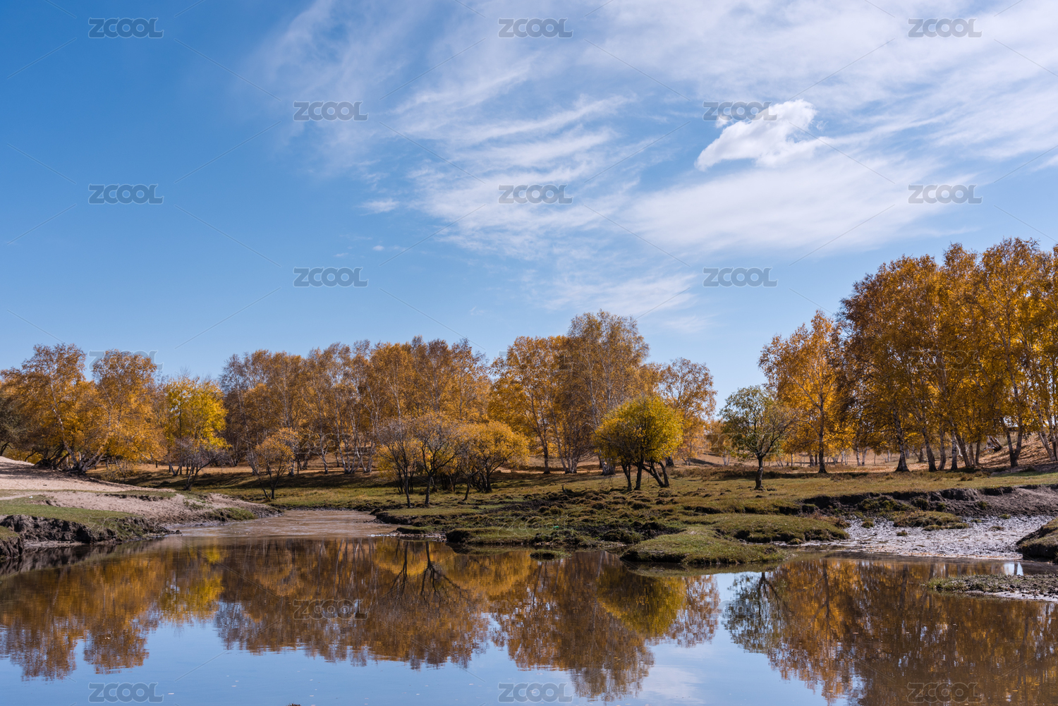秋天内蒙古乌兰布统的公主湖边的白桦林倒影
