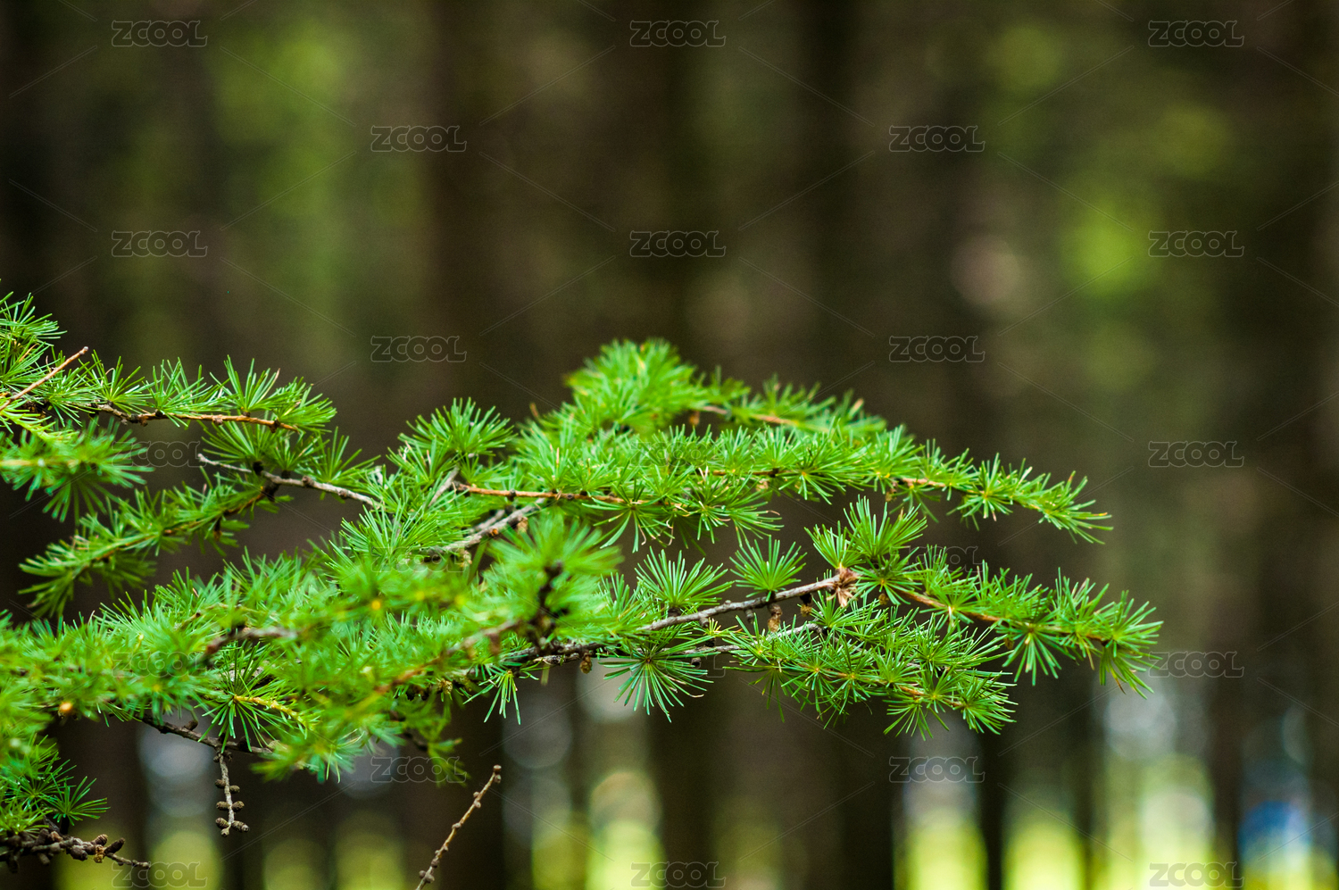 森林公园绿色的落叶松树枝特写