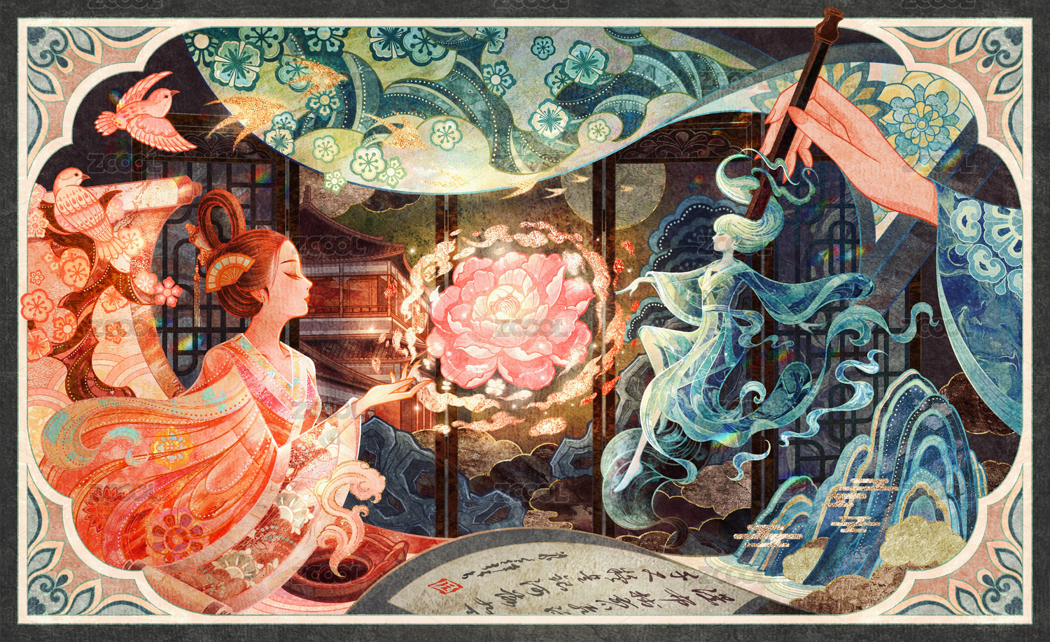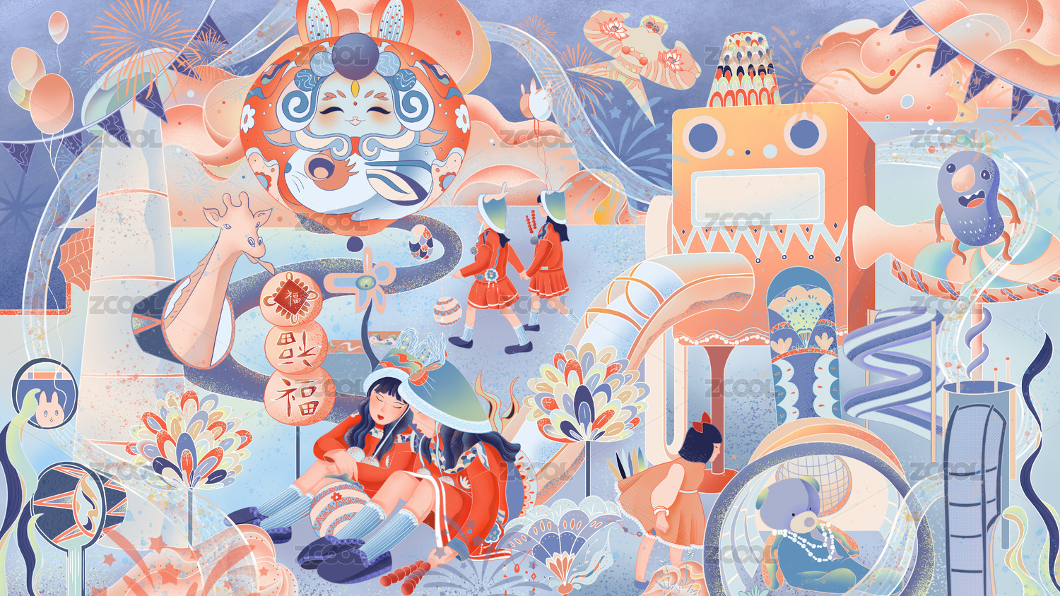 国潮风中秋节团圆夜晚聚餐赏月赏花灯插画