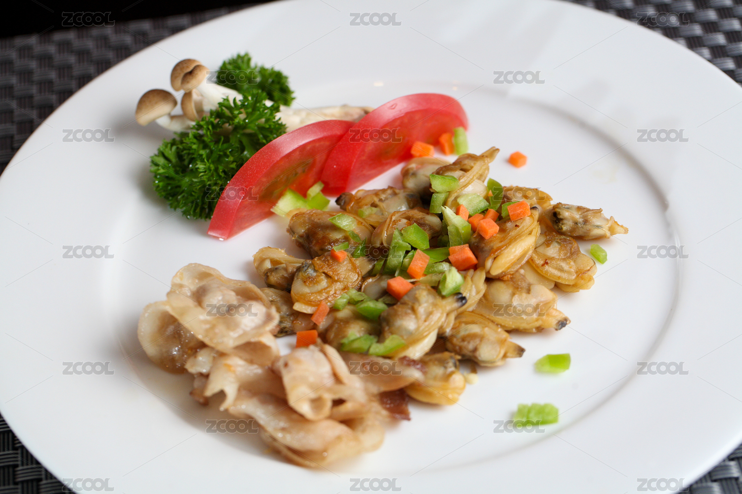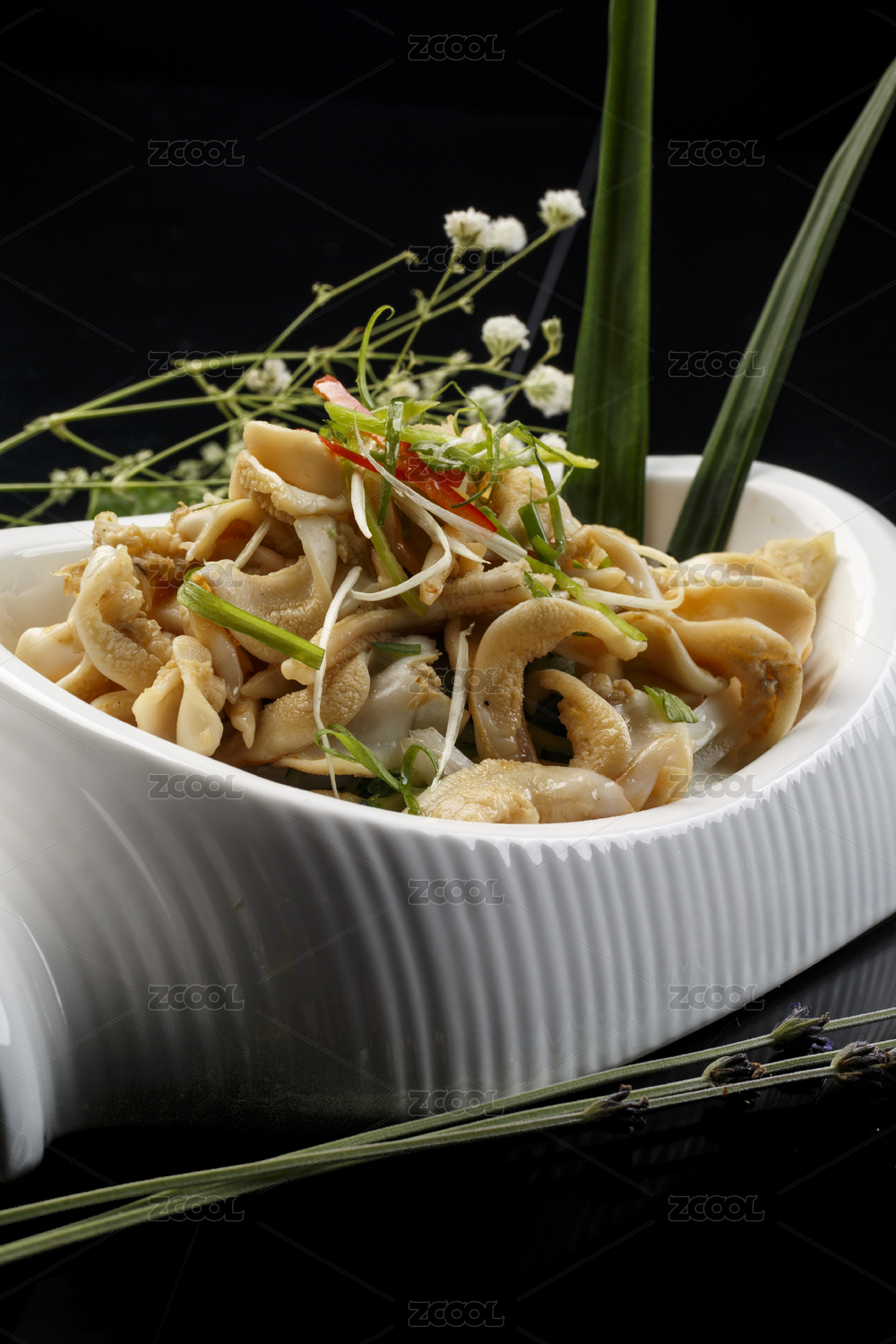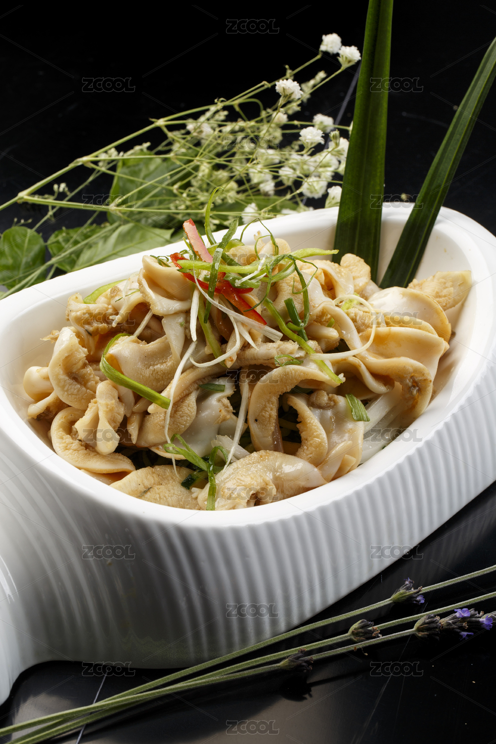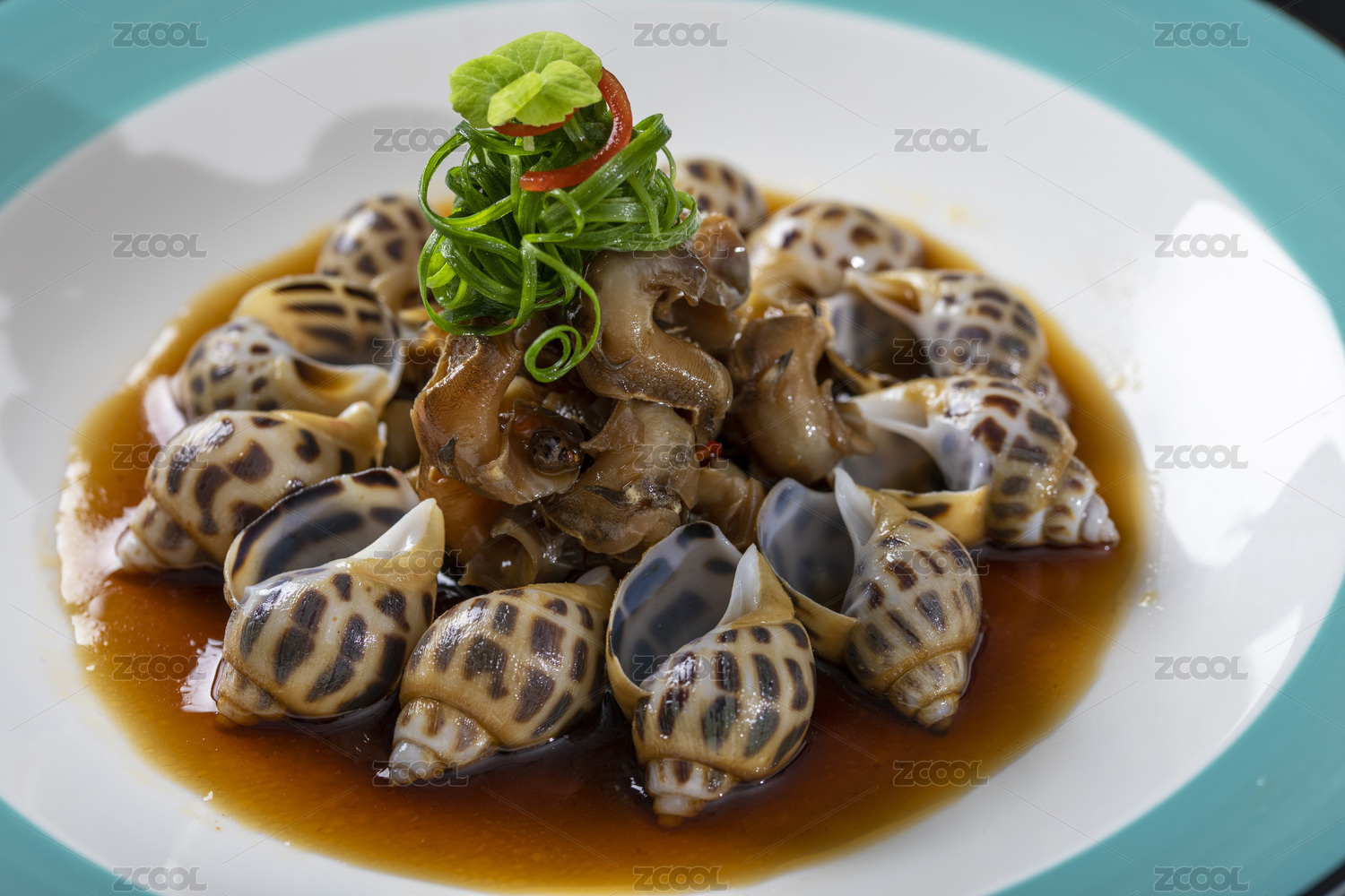 水平形瓷盘装的温拌海螺头