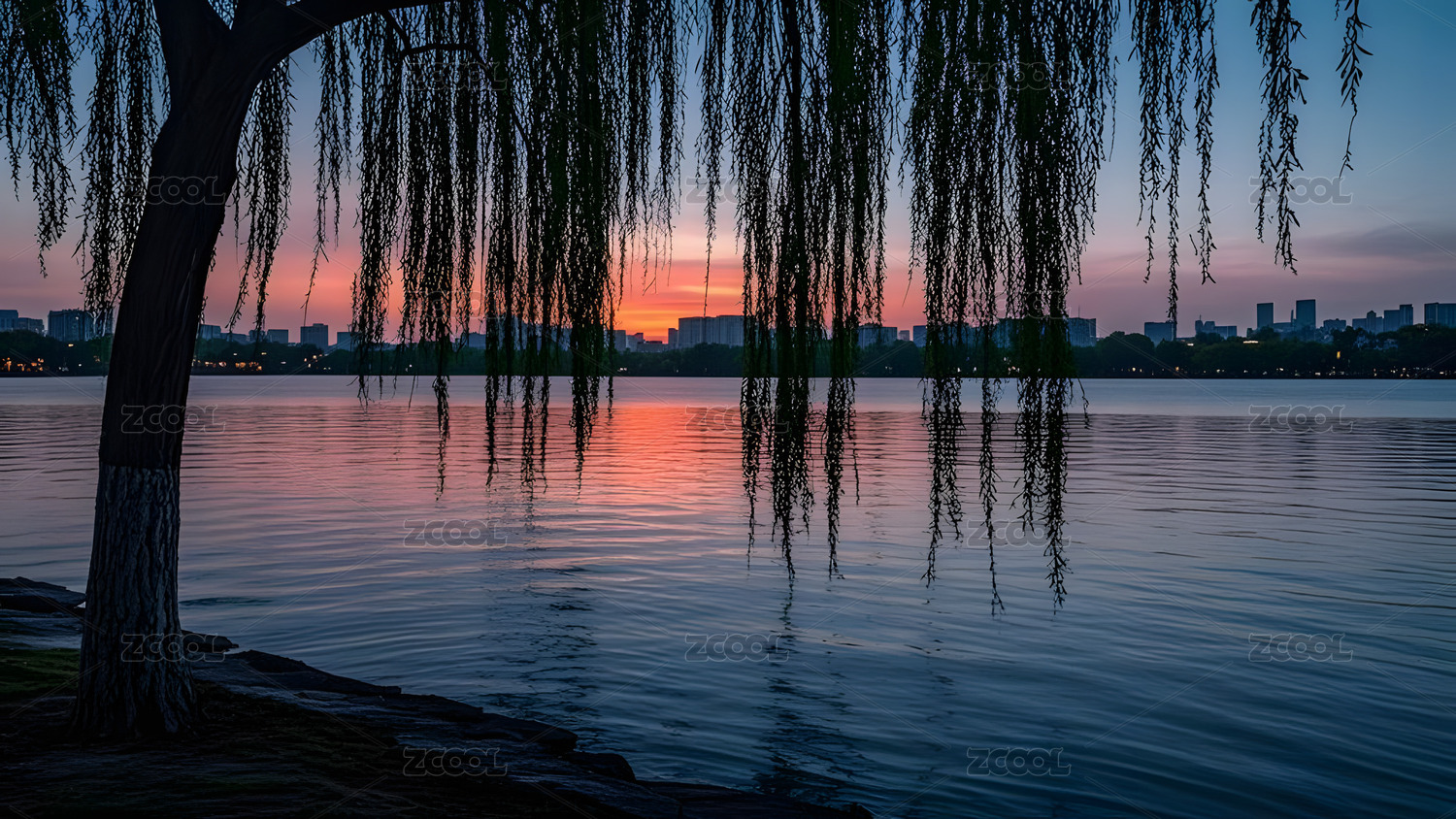 中国浙江杭州西湖风光,西湖垂柳与西湖手摇船