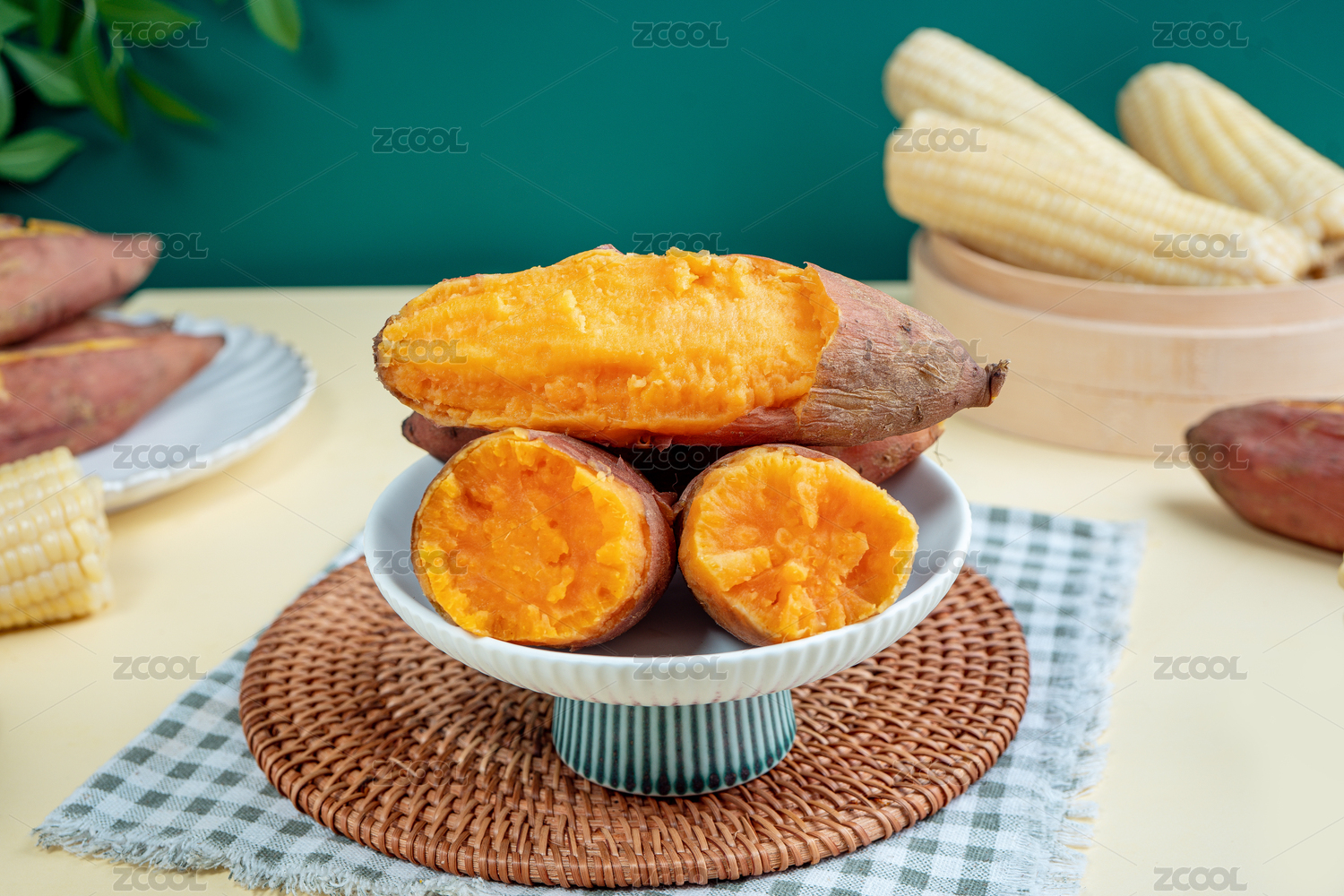 蒸煮的红薯和玉米组合